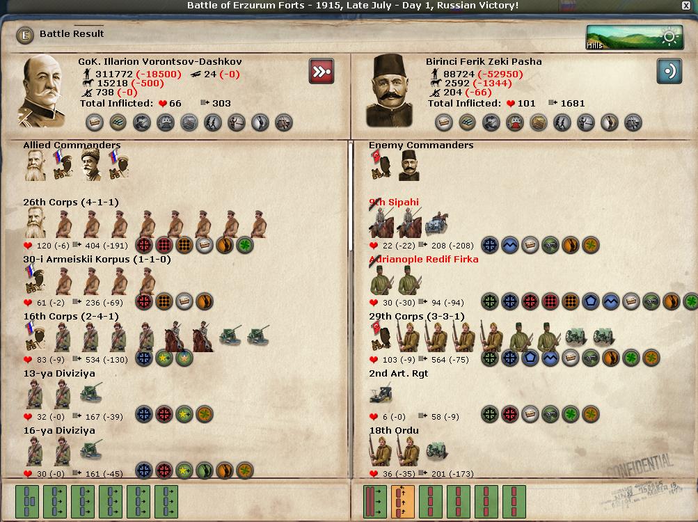 In an unbelievable logistics success my troops make it to Erzurum. In another miracle, the main Ottoman army moves away. Either it ran out of supplies (but it was close to a depot?), or spread out too thin, with 5 separate stacks harassing my lines from Batum to Erevan, or... I don't know. Either way, I went for an all-out assault, knowing that it snows early in the mountains, and I will not get another chance this year.