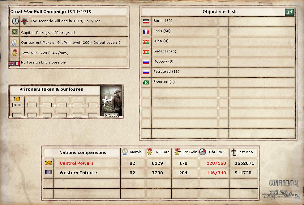 Erzurum is the first addition to Allied objectives (although not the first loss for Central Powers - they got penalized when Trento fell). I wish there were more objectives to be worried about... after all, the way it is now, I can fall all the way to Moscow without having to worry about any morale loss.