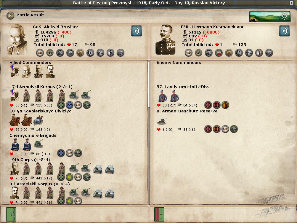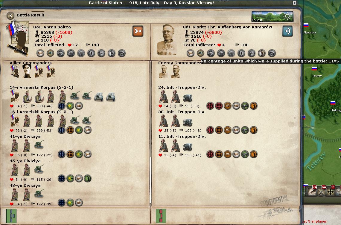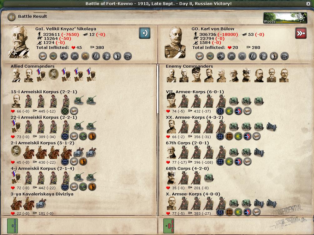 Kowno is quickly becoming the Verdun of the Eastern front, and today's battle is the bloodiest by far in the entire campaign. What really helps my troops is that the depot garrison surrenders, providing much needed supplies and ammo straight to the front lines. Defending in a forest helps as well.
