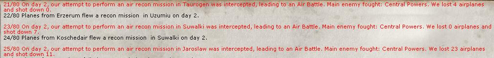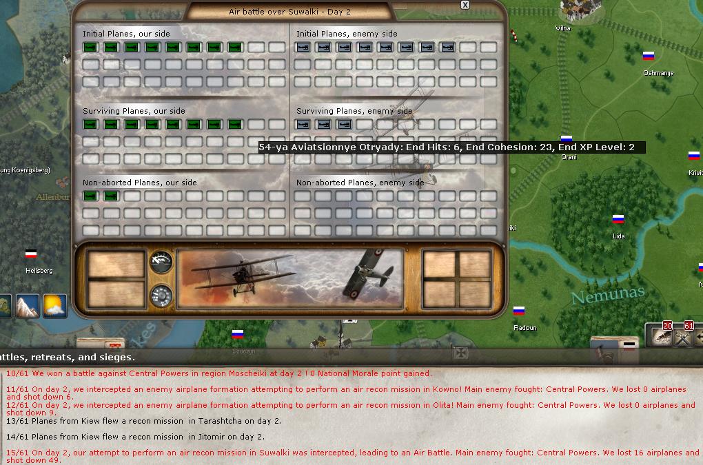 4 battles, mostly victories. My fighters are clearly making an impact. One unit, the 54th squadron, has reached level 4 experience. Total tally: 411 losses to 138 victories.
