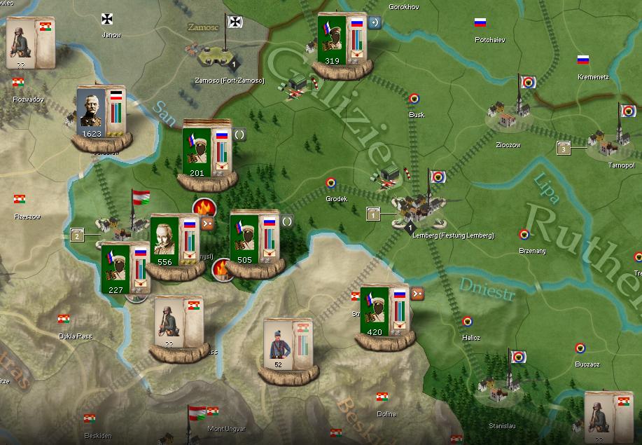 In the south, things are still rough. Another battle, another 15 losses, for grand totals of 406:85... No matter. Next turn my southern squadron will arrive to Lemberg from Kiew... let's see what Austrians can do to protect themselves.