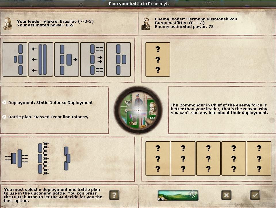 I may have won a battle at Kowno, but the strategic victory is still up for grabs. Central Powers hold a 3:2 manpower advantage, not to mention aerial advantage. Their leaders are also smarter. Here's my lineup for strategic ratings: 6, 5, 4, 4, 4, and 4. Here's German, to the best of my reconnaisance: 9, 8, 8, 7, 6, 6, and 6. My Lechitski (6-3-1) versus von Kluck (9-7-0). Ouch.