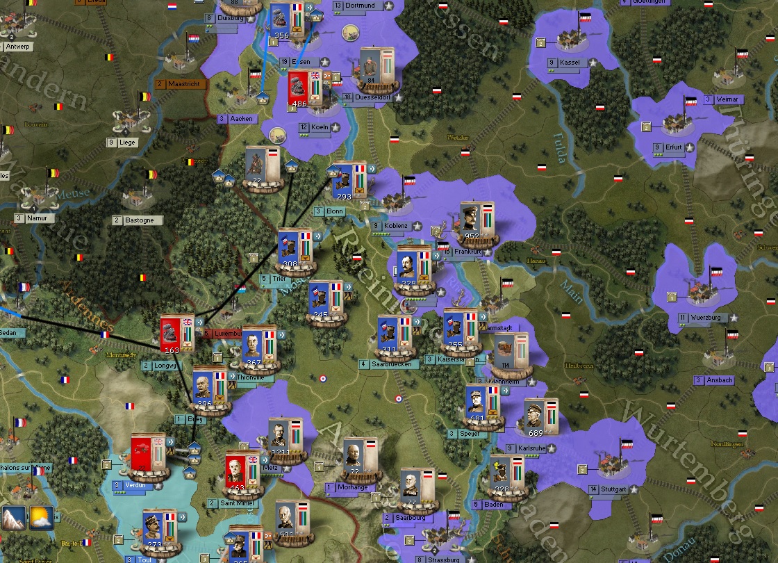 I'll try to build a depot in Aachen with an army leader who has two supply units. That should be good for us, since Longwy is 3 regions away and has a depot and maybe that will push ammunition to Essen which has a level 3 depot.