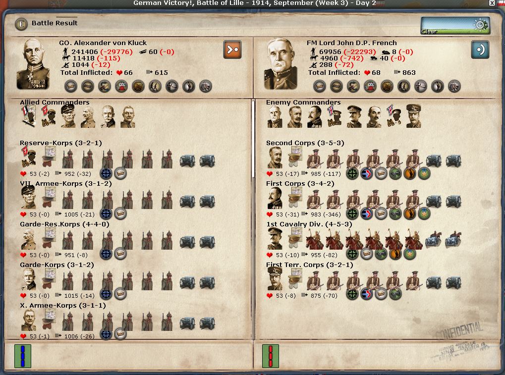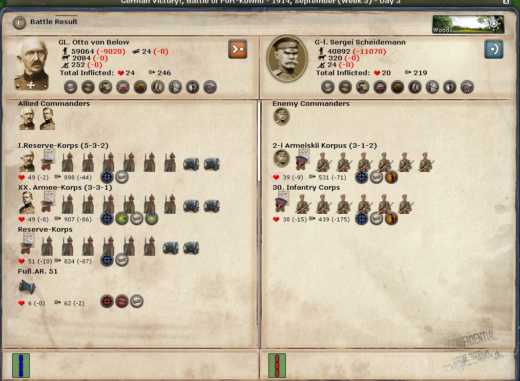 The battle of Sedan is one of these typical frustrating battles, where I am attacking with 10:1 numbers and still take higher losses thean the defender - a victory none the less. Another victory around East Prussia and the siege of Kowno has begun. The first battle with the BEF goes well as well and my hopes for my ideal defensive line are rising from turn to turn ;-D.