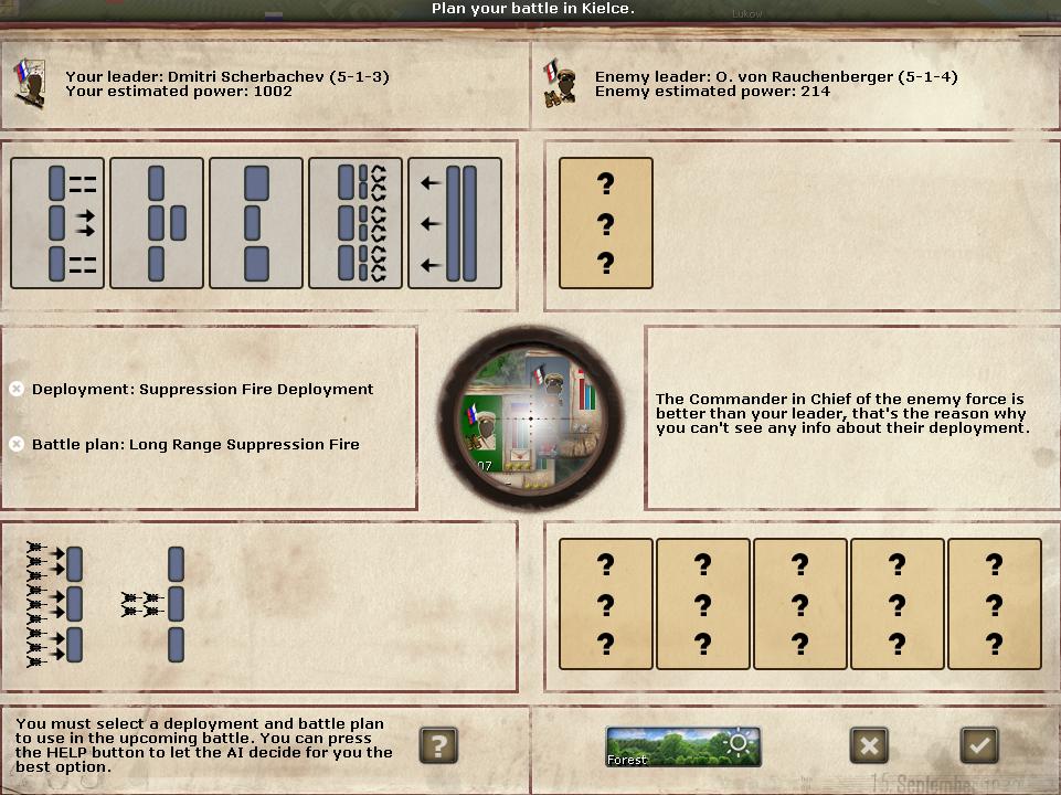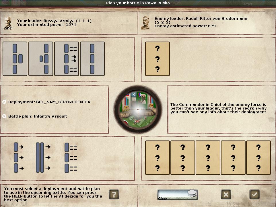 Background: CP created a line of single-corps stacks south of Warsaw, and I attempted to pierce them in the middle, with no enemy army that could reinforce. At least that's what I thought until I saw a 1299 stack just across the river. With the battle lasting only one round, they haven't had a chance to join. I tried artillery suppression battle plan, as I do not get to see it too often. Sadly, it failed.