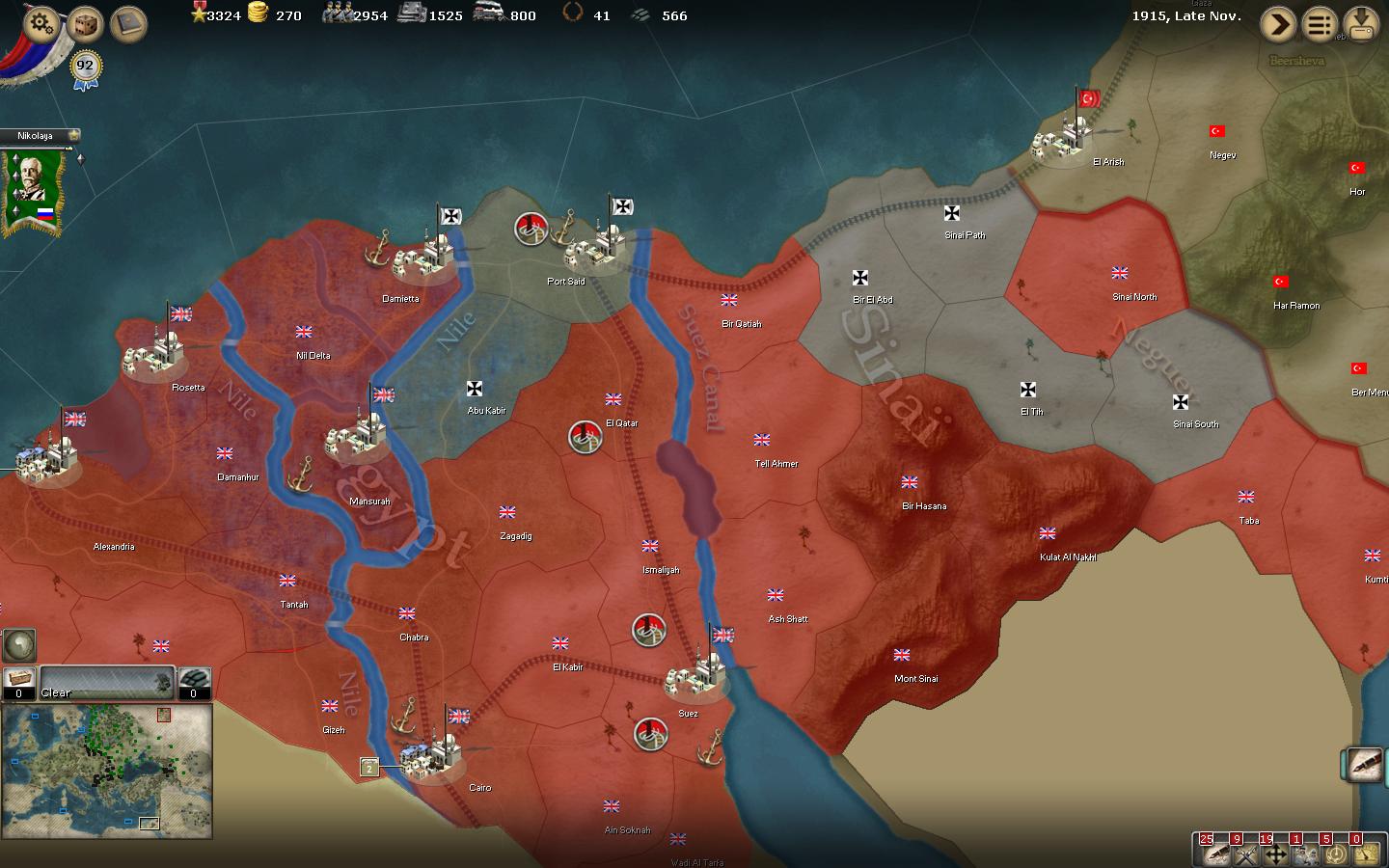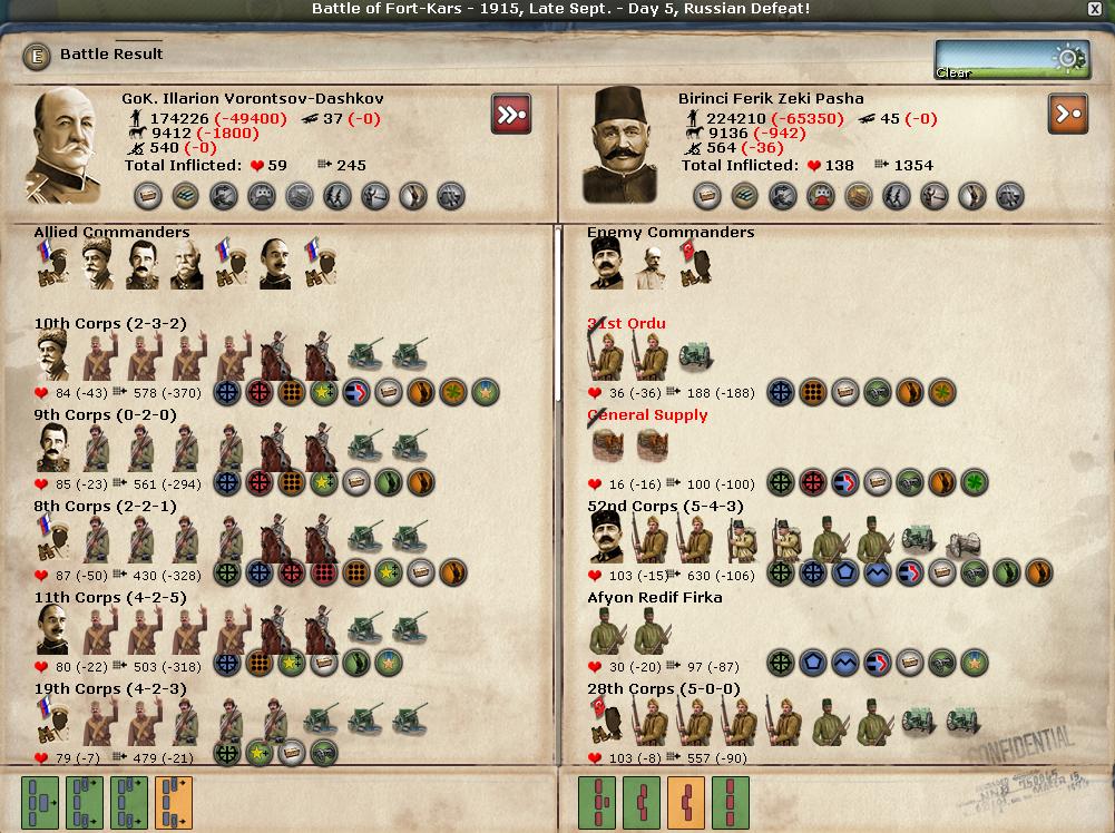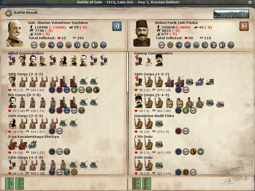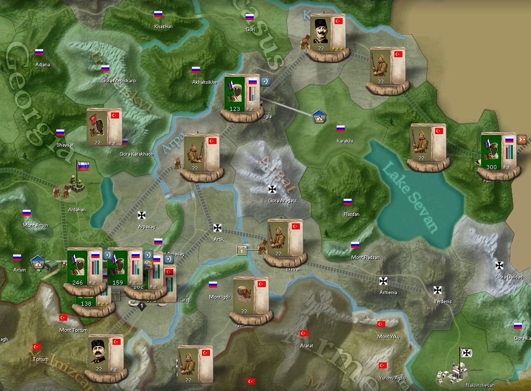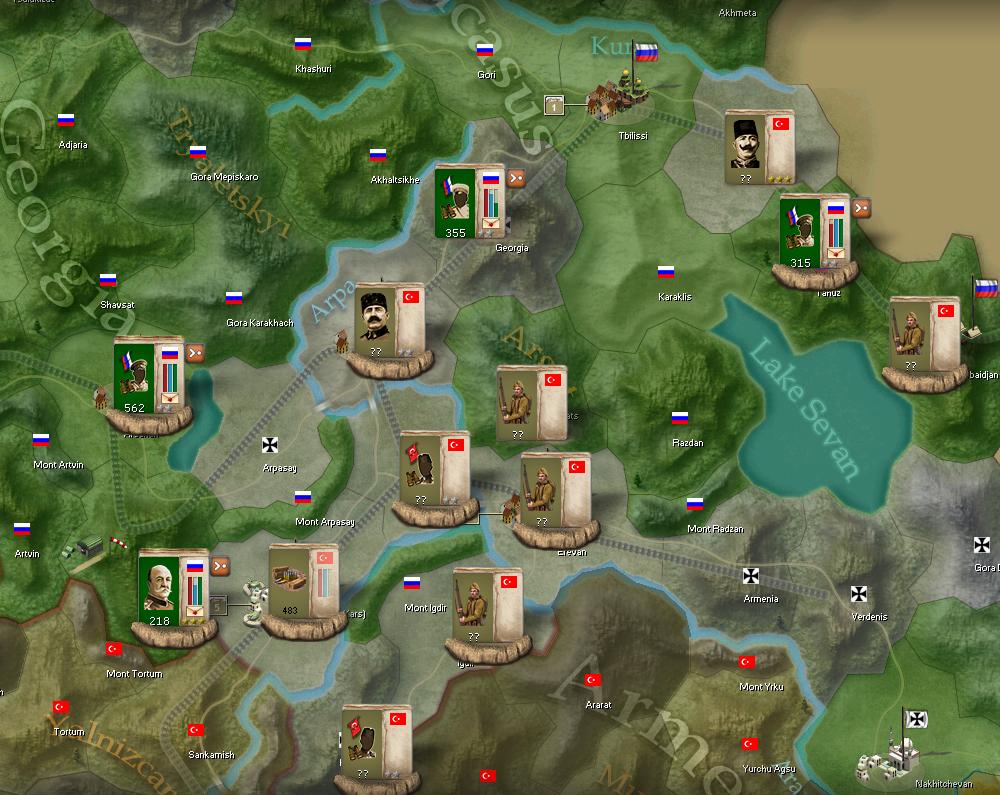 My 4 stacks near Kars are all down to half their strength, and they are retreating. I had a stack by Tbilissi that is now out of supply, forced to forage in the mountains. And a Turkish cavalry unit just headed north to Vladikavkaz to cut off rail supply.