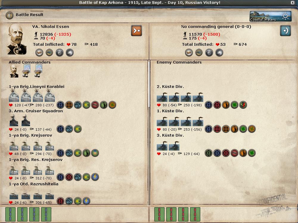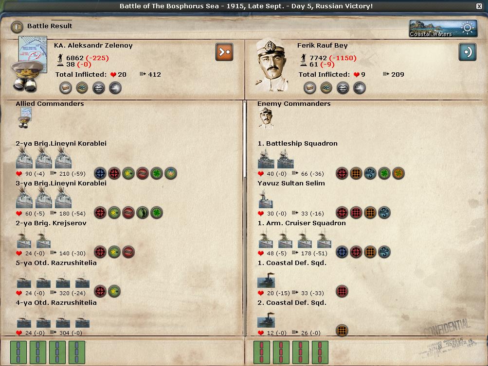My Black Sea fleet finally catches up with the Ottomans avenging the loss of my eight submarines. Turks pay with 8 destroyers (a full unit) and an armored cruiser. No morale is gained.