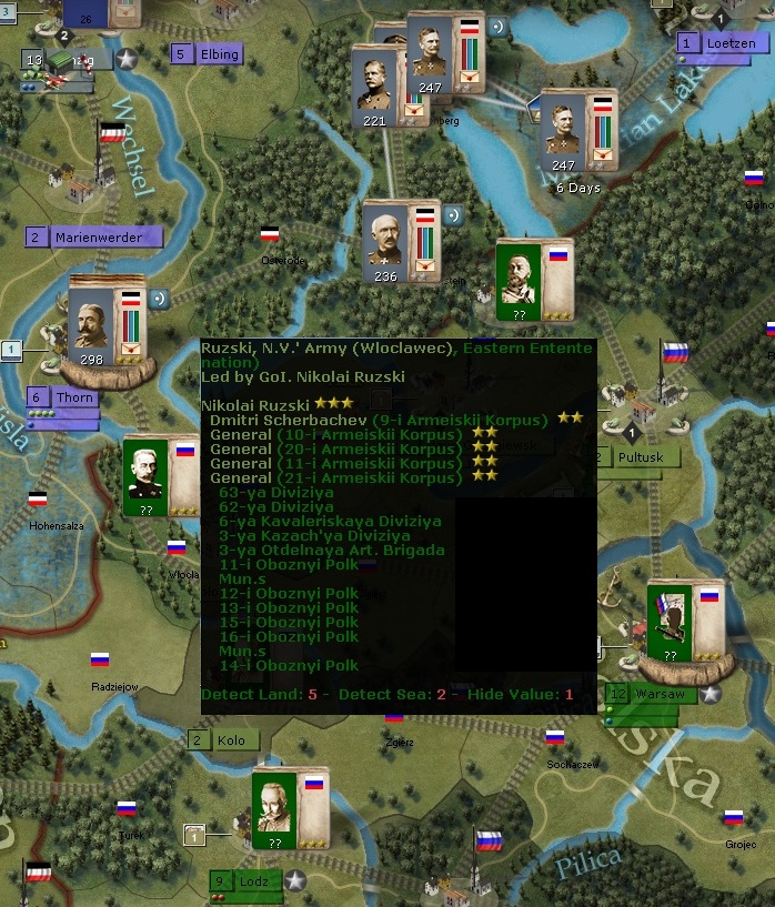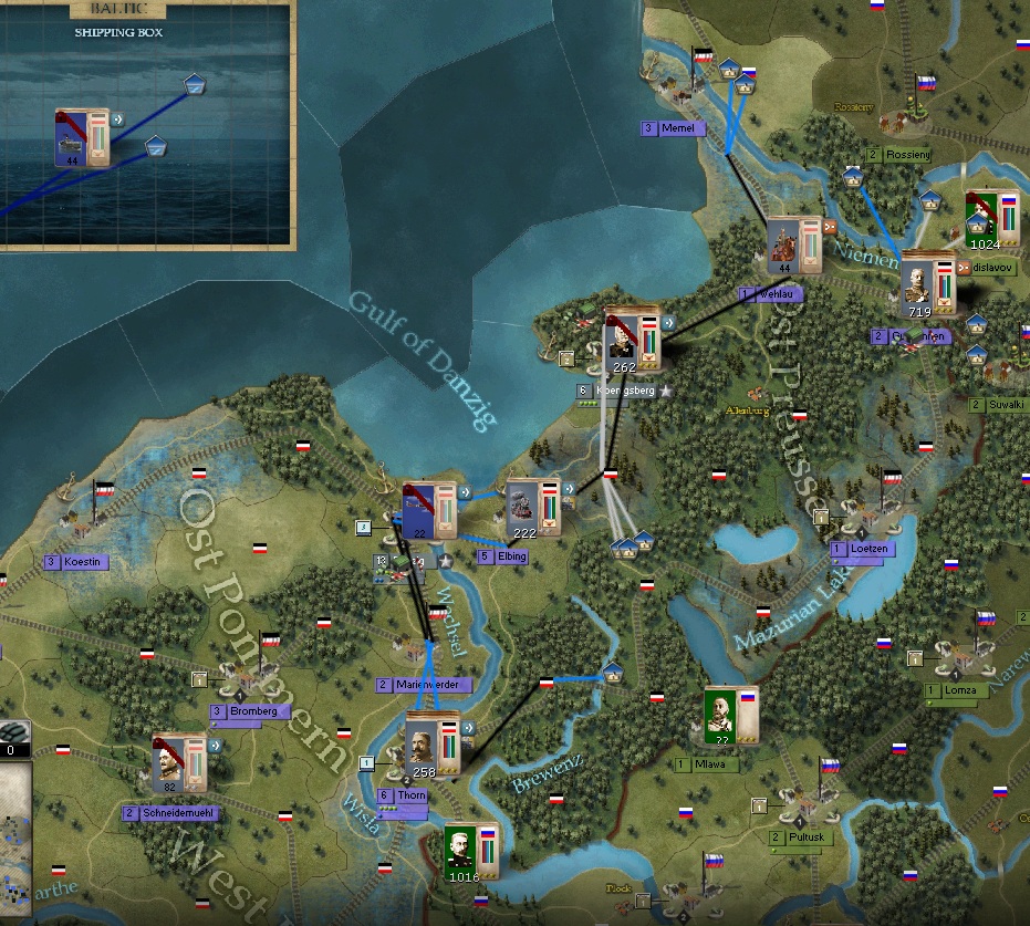 From Konigsberg, II Kavallerie (which must be renamed...) sent north into Dorbiany, to be joined by I Kavallerie-Division. I, XVII, and XX AK marched south to Tannenburg Forest to protect against incursions by the Russians there. I ReserveKorps moved to Allenstein from Elbing.