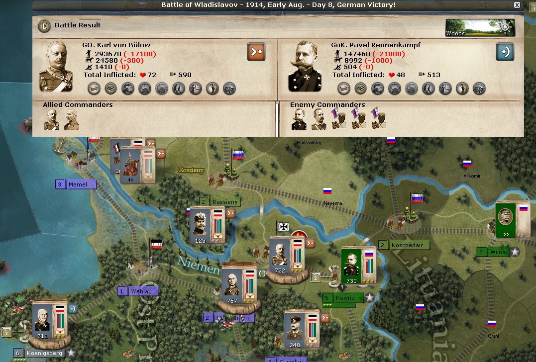 In Prussia, an offensive by 1 and 2 Armee was launched against Rennenkampf's Russian arny in Wladislavov, out of Gumbinnen. IIKavellerie ordered into Taurogen, and II and III ArmeeKorps into Suwalki to support flanks.