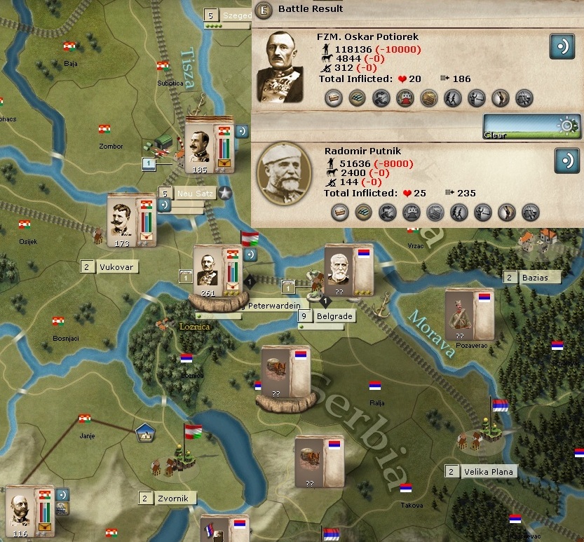 In Serbia, ArmeegruppeKrummer took rails from Zagreb. They are ordered to set up defensive emplacements in Zvornik, provided they can arrive in time. This cost 16 RP and will take roughly 27 days with no delay. Potiorek's 6th Army is ordered to threaten Belgrade at Fort Zemun. XV AK is ordered into Vukovar.