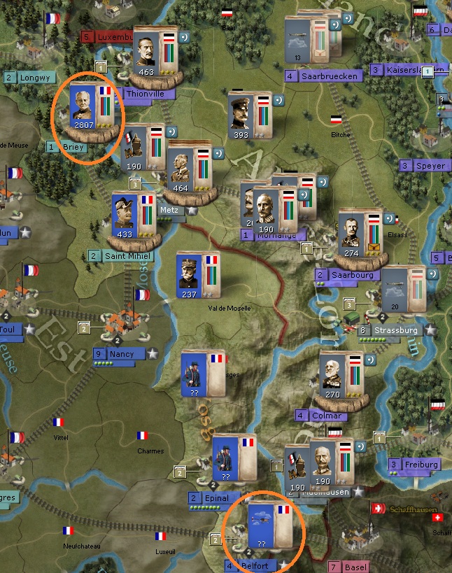 In the west, XIV and XV ArmeeKorps were moved south from Colmar to Mulhouse to begin entrenching there. Likewise, II and III BayKorps were moved from Saarbourge to Morhange. KoniglischeWurtemburg Armee marched out of Metz to Lorraine - they will be made into a regular army once theatre operations are implemented in this sector. Hopefully they will march to support Metz in the case of attack. Maybe this means their entrenchments will suffer, I don't know, but I am moving them here for the beginnings of a secondary line. Their command structure is at 24/22, but I'm not altering it at this time. As replacements, XIII-AK march to Metz from Thionville. Also, IV Kavallerie is ordered to redeploy to Wehlau, north of Konigsberg and assume offensive operations in northern Russia. Apparently their deployment orders were mishandled in July... This cost 16 RailPoints.
