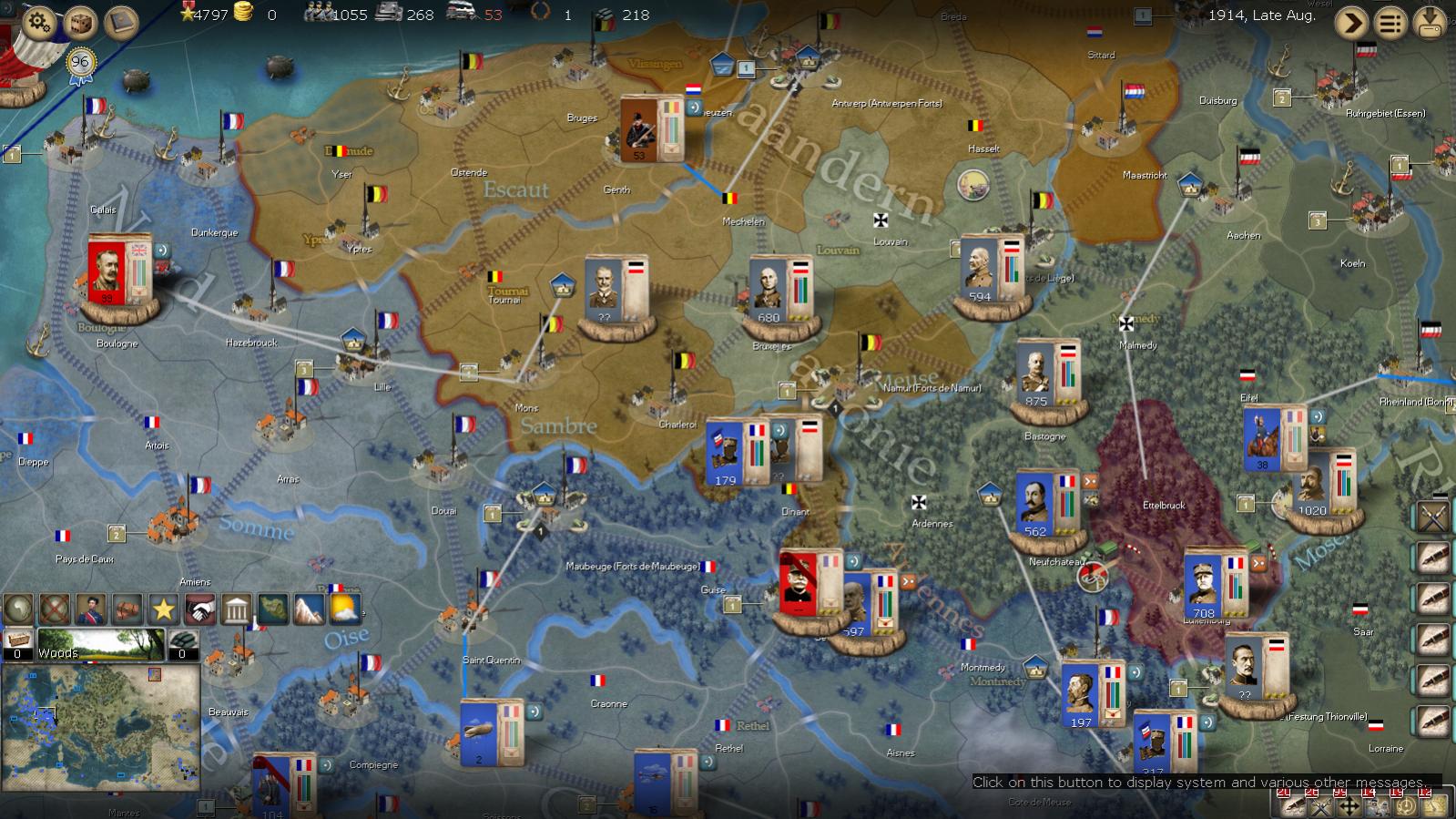 Now I am taking a gamble, I believe the last before I settle down for drawing my battle lines along the ORANGE line. That will be, the attack on Brussels. The combined armies of the British from Amsterdam, and the French Quatrieme Armee, will attempt the final breakthrough into Brussels. This position would not only remove the only depot in German control in Belgium, but would also cut their invasion force in half. I predict the battle may result in a defeat. But if it succeeds the rewards will be great, if it fails...., then we must give up on Belgium. If we give up on Belgium, we fall back to positions behind the Orange Battle line, Behind the Somme and the Sambre Rivers, and the Ardennes.