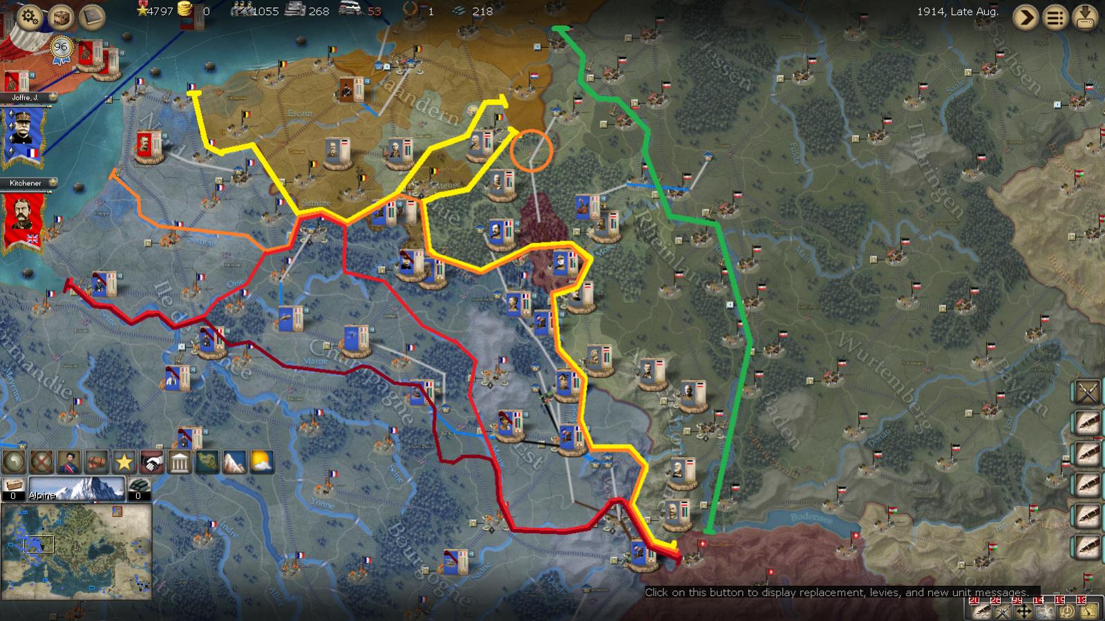 For reinforcements I purchased mostly troops and the rest of the French Field artillery. I may have to get some Fighter Planes soon, this constant replacing of Recon Planes can be draining, maybe I can force the Germans to be drained instead.