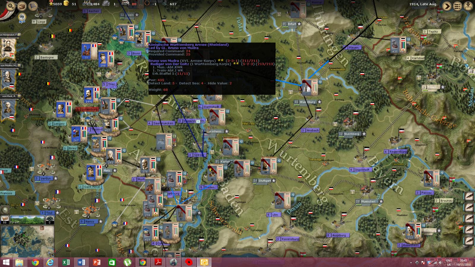H Gilmer3 wrote:I know my WE AAR was against the AI of the Central Powers but I find it fascinating that the very strategy I used is being tried by the WE player. Trying to force the way through the lightly defended flank that Luxemburg centers on. I pushed through as many troops as I could into that corridor with only keeping enough to not allow frontal attacks from Metz and south to occur.