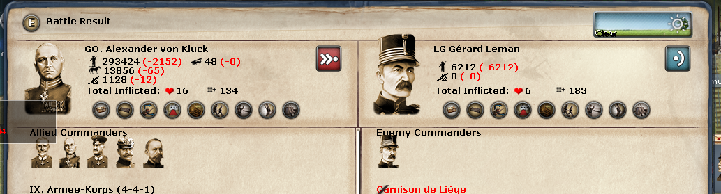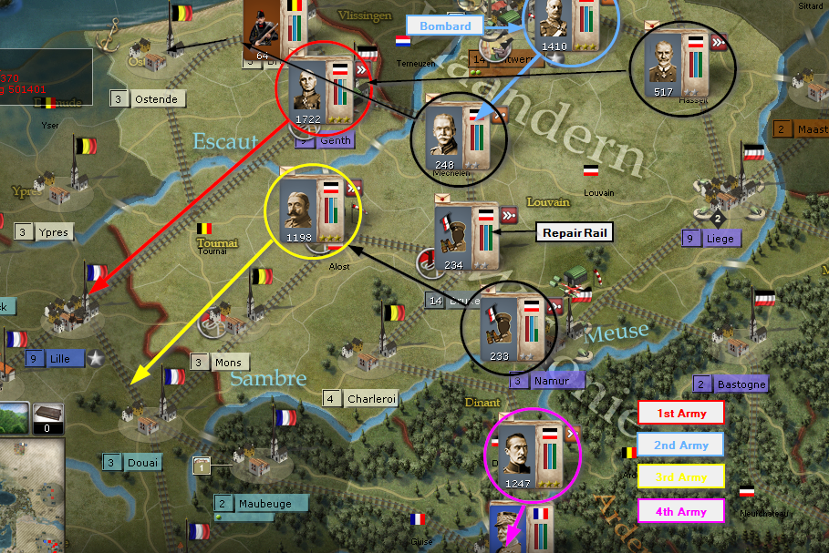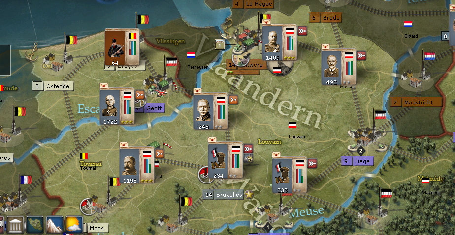 For this next week, the bombard regional decision card will punch through Leige. 1st Army will push on Genth. Marwitz's Cavalry corp will detach from 1st Army and take Bruges. 2nd Army will push on Antwerp. Von Quast and Emmich will detach from 1st and 2nd Armies and camp on Hasselt and Mechelen and take military control. 3rd Army wll push through Brussels and hold up at Alost. The 4rd Army will stop just north of Sedan.
