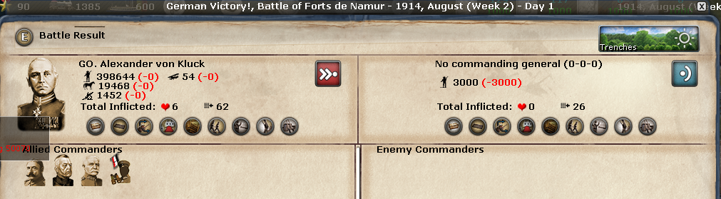 The 3rd Army pushed on Namur and the 1st and 2nd consolidated on Leige. In this mod, you can't move past a level 2 fort in one movement. 1st, 2nd and 3rd Armies encountered a lone Belgium corp at Namur. This delayed the attack on the Namur Forts.