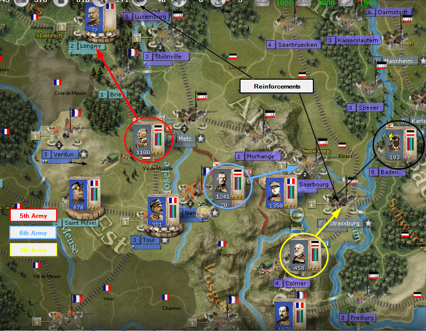 With a combined and reinforced 6th and 7th armies, I can concentrate on the French 1st Army, once the French 2nd Army is defeated. I'm guessing and hoping he pushes the French 3rd Army into Metz. This is luring him away from Paris and makes it more possible for the Schlieffen Plan to succeed.