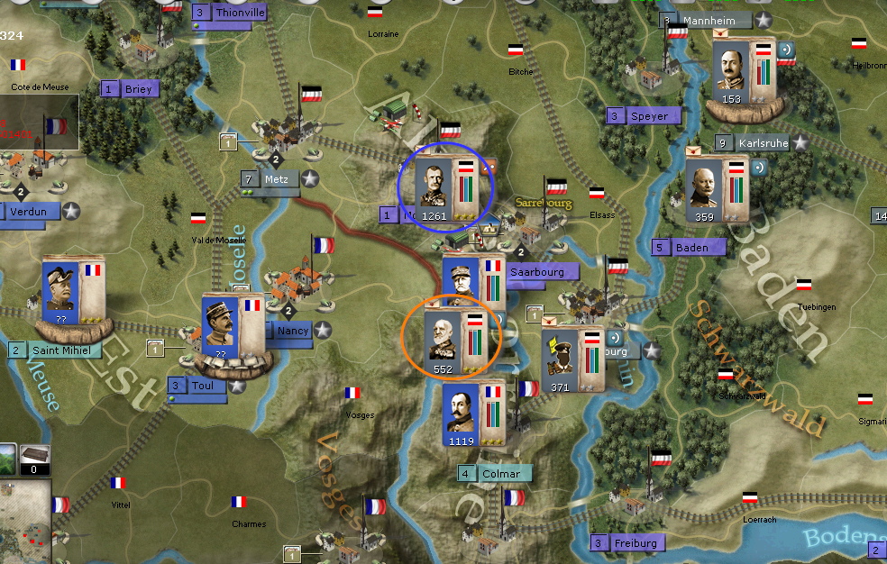 The French player is following the French war plan perfectly and it's working. Mulhouse and now Colmar are in French hands. Sarrbourg has been breached. The German 7th Army doesn't start as an Army and starts out of range of Molke. That makes defending the south more of a challenge. The lack of connecting roads from Colmar to Saarbourg makes MTSG impossible. So this is a good attack for the French. I'm not sure yet what the overall affect of it will be versus the Schlieffen plan, especially with this mod, which makes the Schlieffen plan doable. The good news is that the German 7th is now in range of Molke and can form into an Army. I moved it into Saarbourg in the hopes of an attack with the 6th in MTSG range. But von Heeringen thought the better of it and didn't attack.