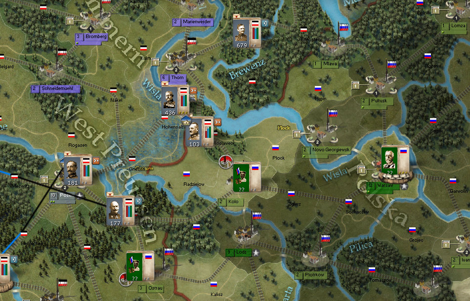 I have to deal with Pleve and 2 key rail lines haven't been repaired yet. So I'm not going to be able to advance on Warsaw yet or Ivangorod. Lodz and Pleve will be removed before I can move forward. Hopefully, the rail lines will be repaired.