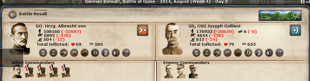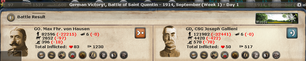 There is now a gap in the French/British lines at San Quetin. The French 5th Army is badly beatup and the Paris Reserves are cutoff in Maubeuge. The British and Belgiums are separated from the French. There's a straight line open to Paris.