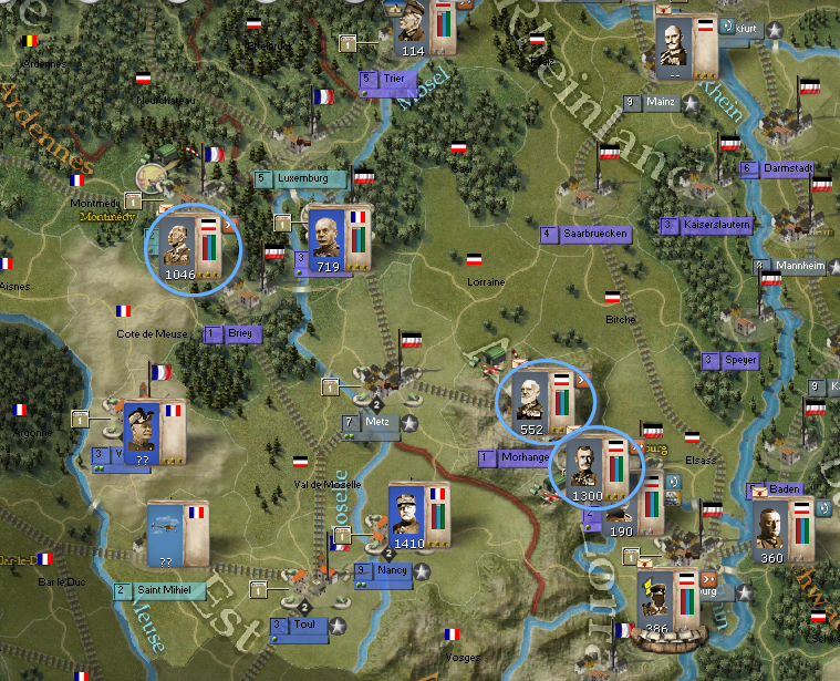 The 5th Army moved onto Longwy. The French 4th Army surprised me with a move into Luxemburg. I'm not sure at this point if I put up defenses against the French 4th and contain it or attack it.