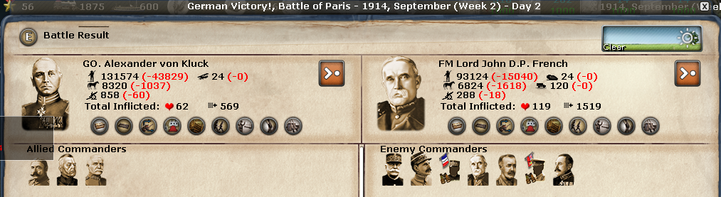 The turn started with the battle for Paris. Though a German victory, the losses for the Germans were big and the French/British did not retreat.