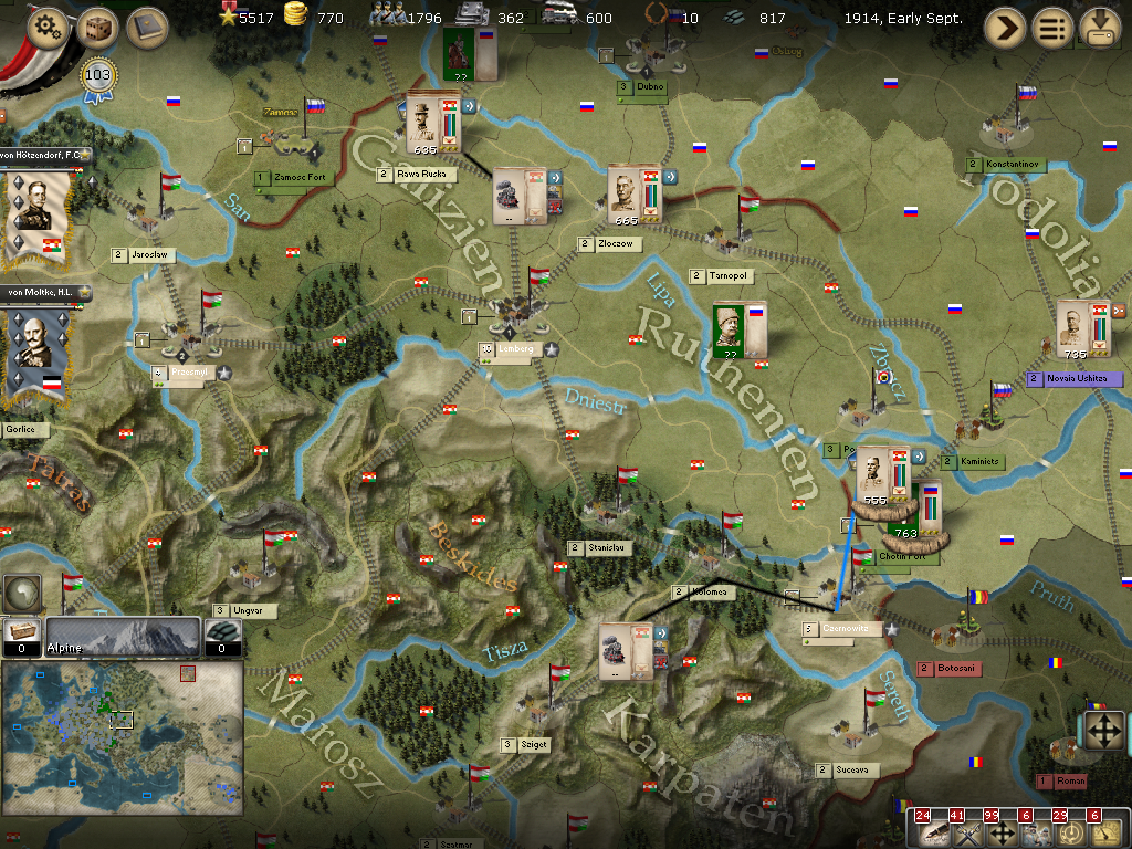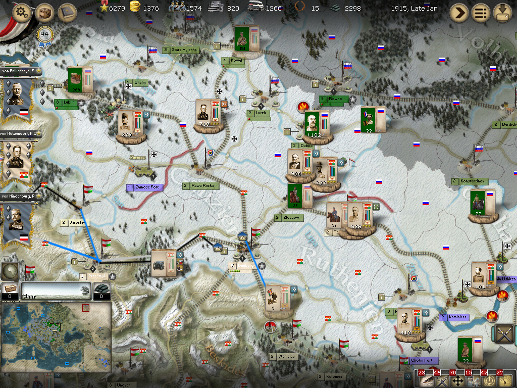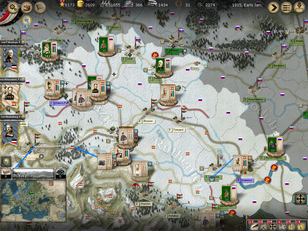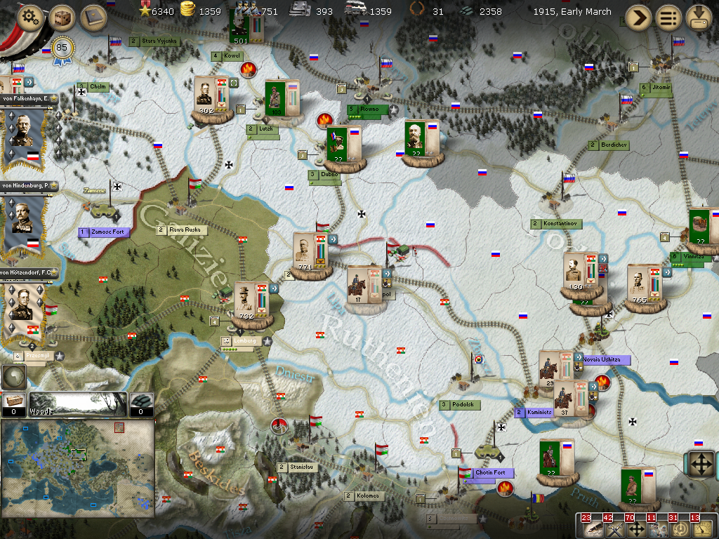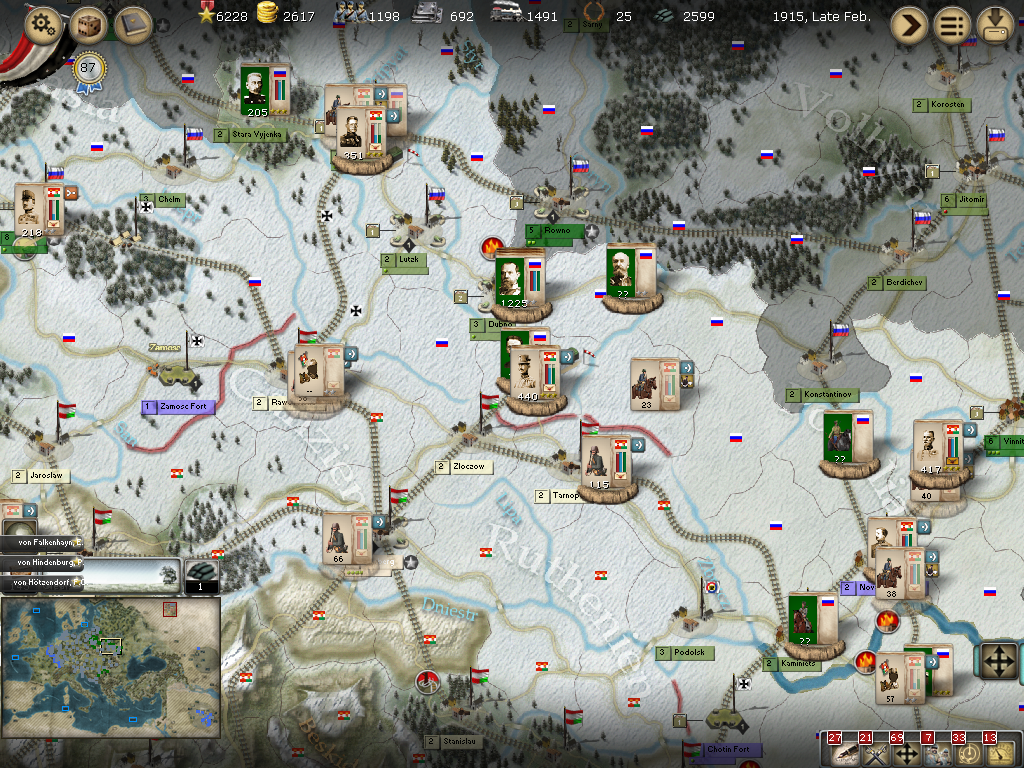 [color="#008000"]AH-Russian Border:[/color] Von Hotzendorf's attack on Kowel failed and he retreated to Novo Volynsk. There are three armies to the east that I will need to reallocate for more strength.