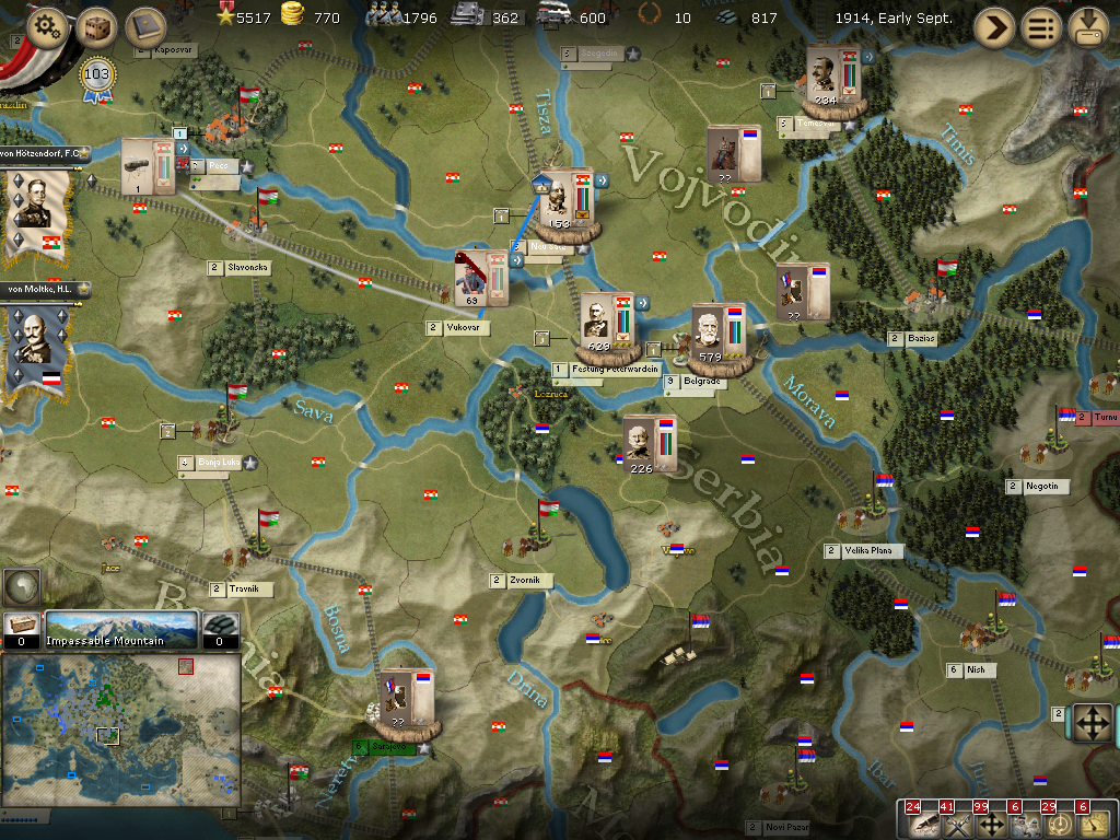 Serbia: Yet another setback in Belgrade, my reinforcements did not arrive in time and we lost our position in Belgrade. The armee in Chotin will most likely need to be railed down to secure this front along with the armee that was already railing in from Debrecen.