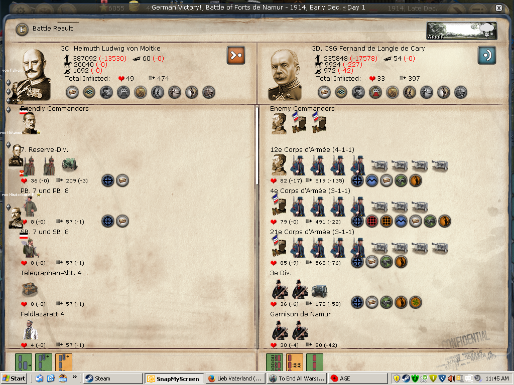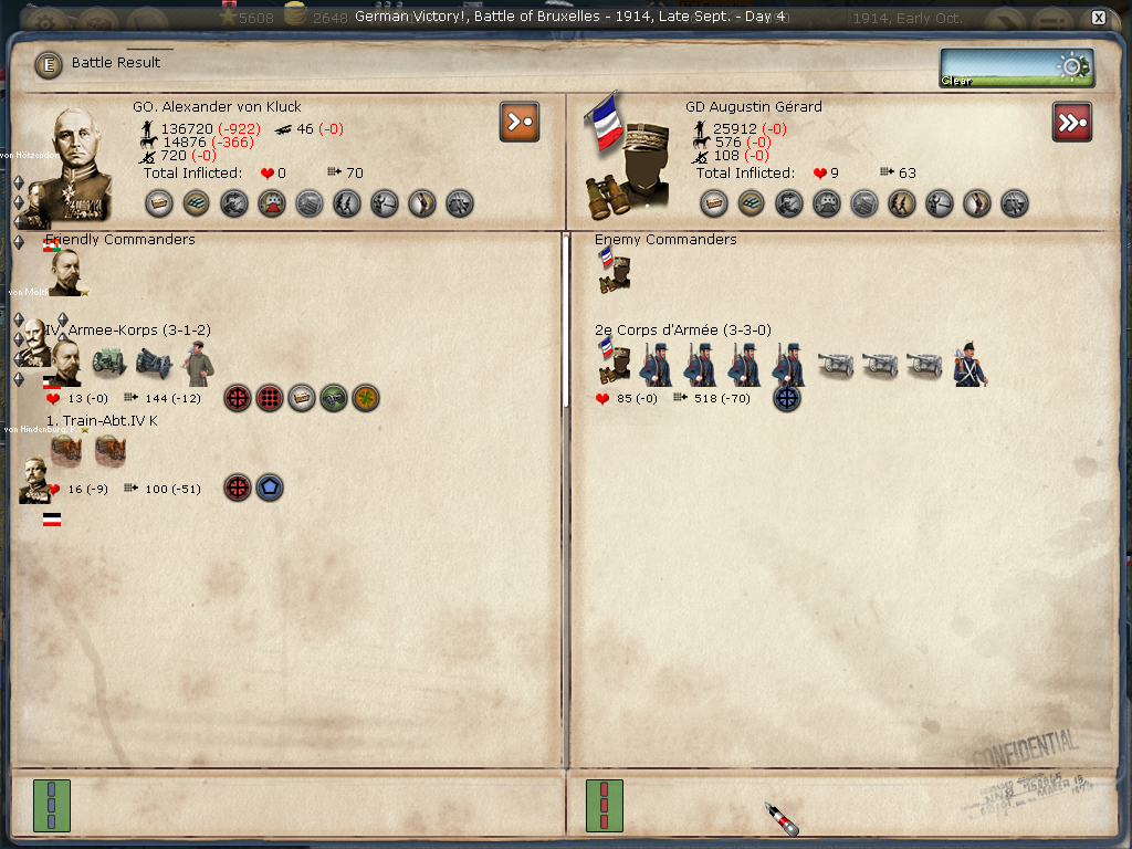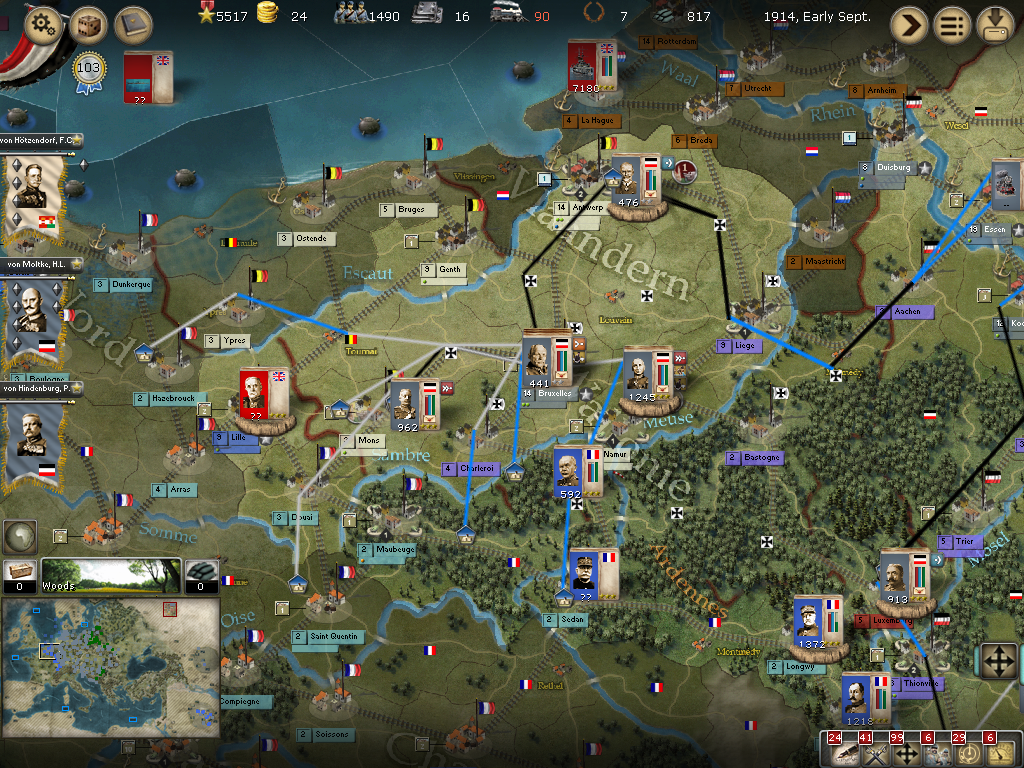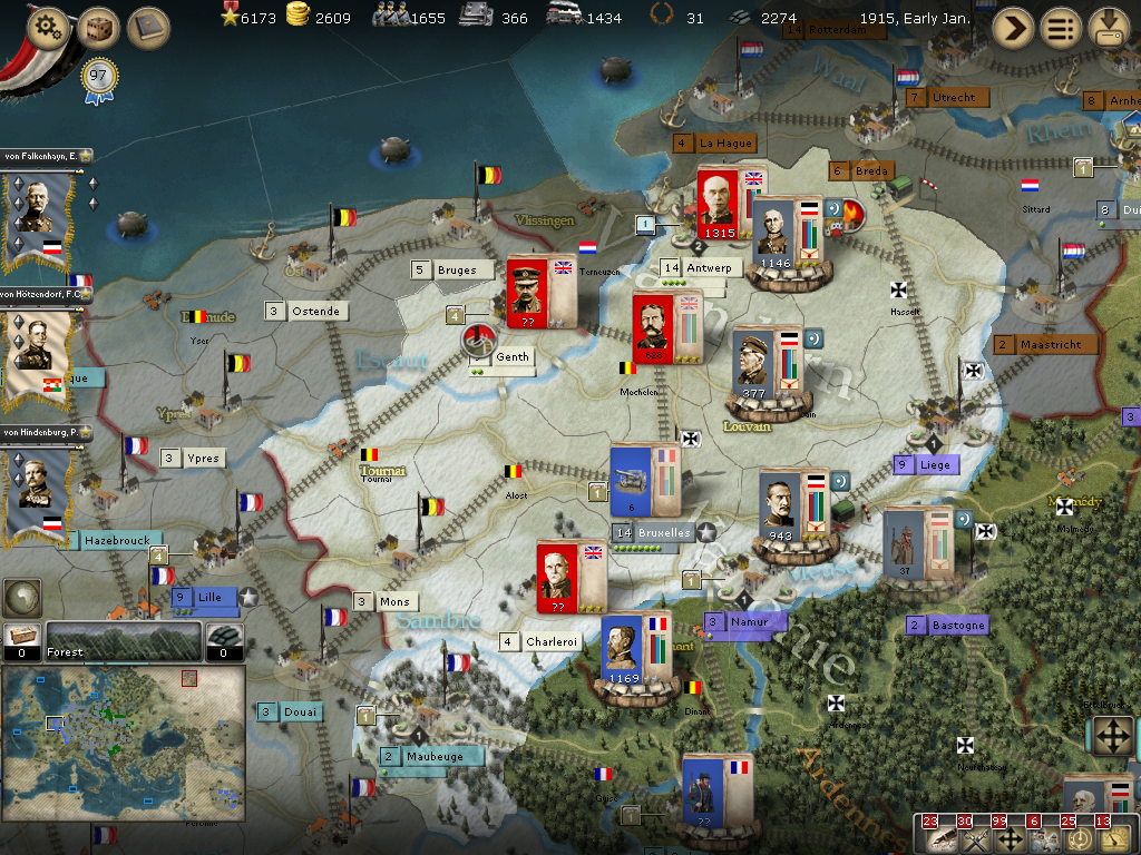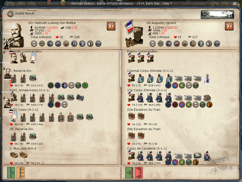 [color="#DAA520"]Belgium:[/color] I was happy just to siege Antwerpen, however, the WE decided to attack when reinforcements arrived. I lost the first big battle then won the second smaller battle. All in all, Antwerpen is in a much weaker position barring massive British troop transports. I have 2320 PWR surrounding it and it appears to have 384 PWR (although I'm not seeing the 400 PWR in prior artillery defenses). It appears the once formidable forces in Genth are now much smaller as they reinforced Antwerpen and met with a retreating loss in Mechelen. I'm not sure if the bug that effected crazy movement (of my forces) is still there or if I badly misclicked, but the unit that I had railing to Mons ended up marching to adjacent Longwy (I was able to call off the movement, fortunately, only taking cohesion loss). I am not seeing a lot of WE strength in Belgium or Northern France.