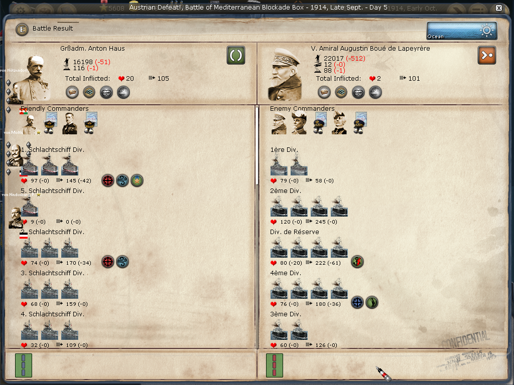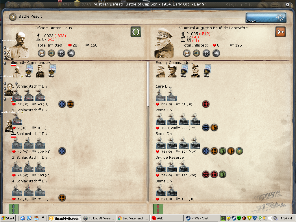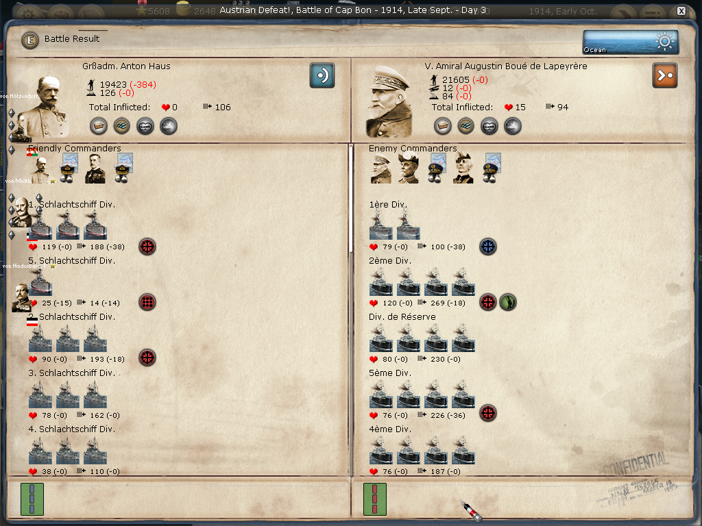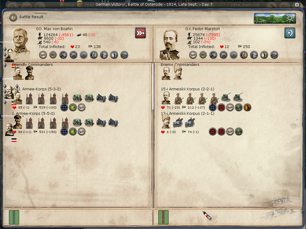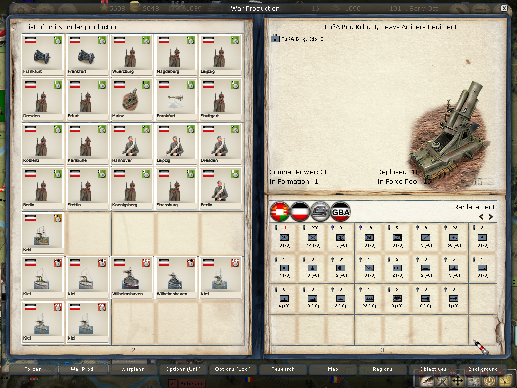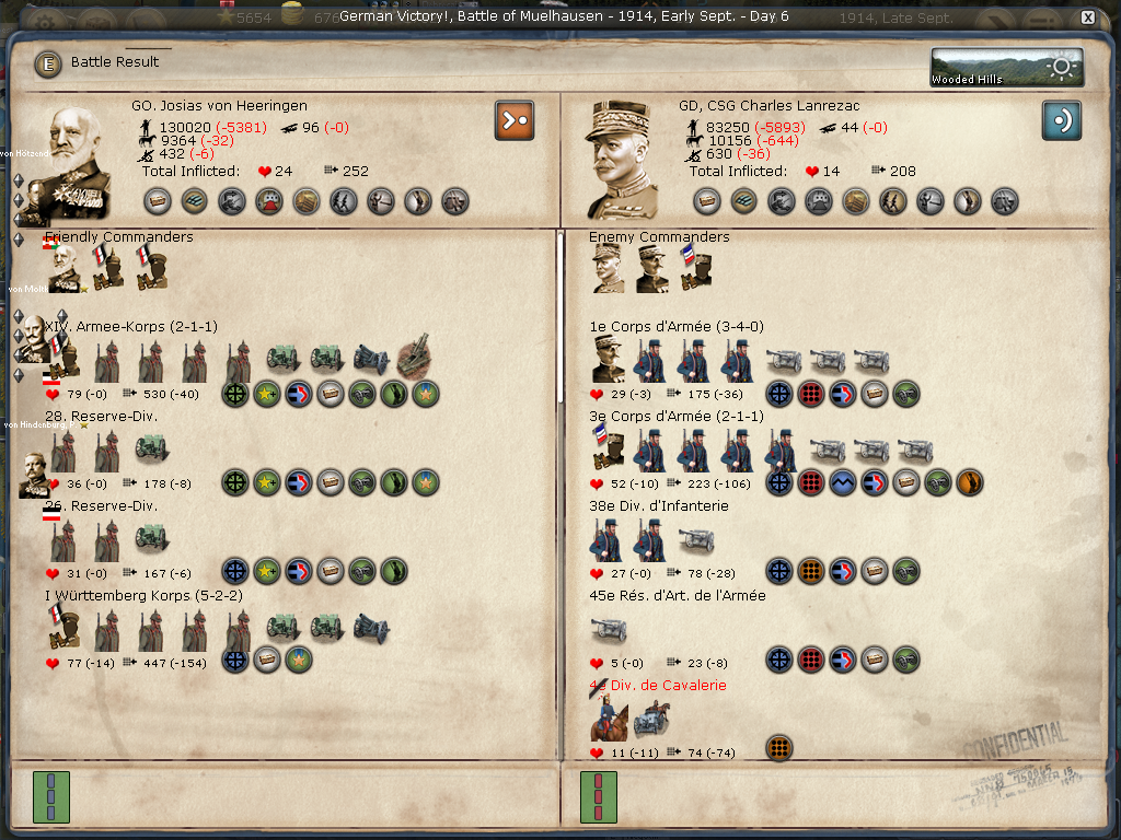 [color="#DAA520"]Belgium:[/color] I was happy just to siege Antwerpen, however, the WE decided to attack when reinforcements arrived. I lost the first big battle then won the second smaller battle. All in all, Antwerpen is in a much weaker position barring massive British troop transports. I have 2320 PWR surrounding it and it appears to have 384 PWR (although I'm not seeing the 400 PWR in prior artillery defenses). It appears the once formidable forces in Genth are now much smaller as they reinforced Antwerpen and met with a retreating loss in Mechelen. I'm not sure if the bug that effected crazy movement (of my forces) is still there or if I badly misclicked, but the unit that I had railing to Mons ended up marching to adjacent Longwy (I was able to call off the movement, fortunately, only taking cohesion loss). I am not seeing a lot of WE strength in Belgium or Northern France.