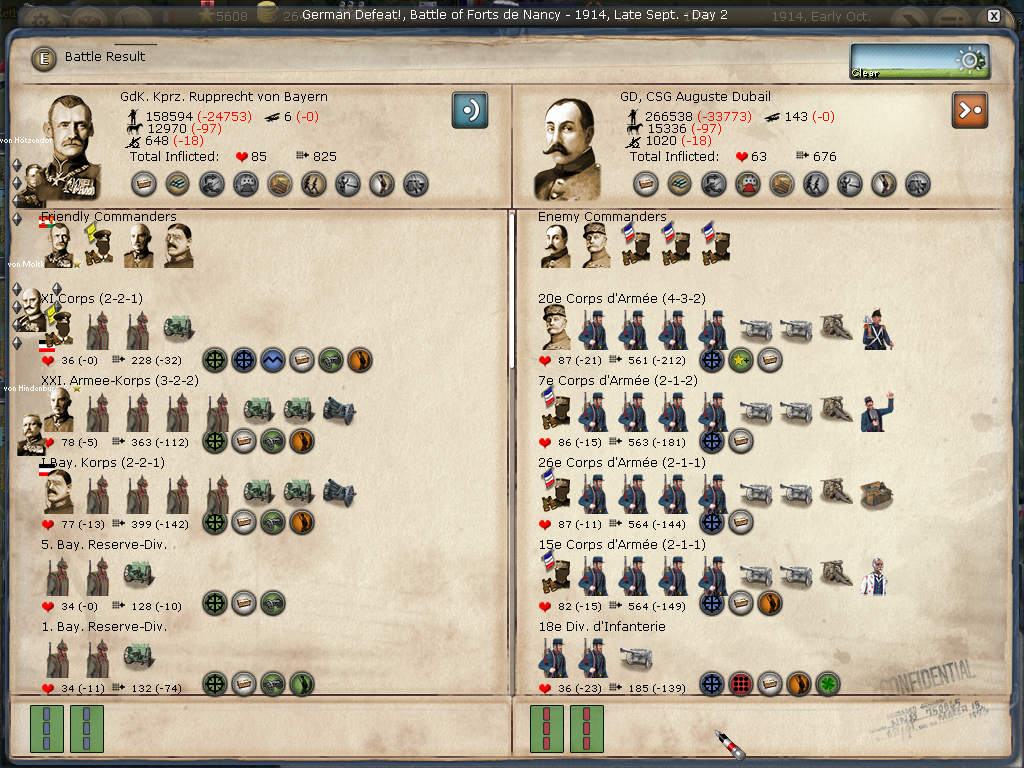 We did manage to take Saint Mihiel (again) although it was costly as von Bayern's Armee was to arrive in time to assist in the assault, but was slowed and won't arrive until day 1 of the next turn. Verdun and Toul have decent sized forces that may want to counter-attack, so I'll be sending another armee there and think that several days will elapse to recover some cohesion for von Bayern.