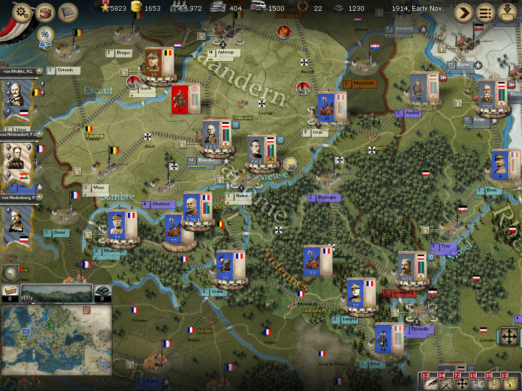 [color="#DAA520"]Belgium:[/color] Well, I got overeager and put von Kluck's 1. Armee on offensive posture, not knowing if the units inside the Antwerpen fort would come out and assist in the defense. They did. We lost. He does stay in Antwerpen, however. The WE did move out of Mechelen so I will definitely bring an army up there and another in Louvain for MTSG and revenge! We cleared out the artillery and supply unit in Bruxelles, but no other fighting on the western front.