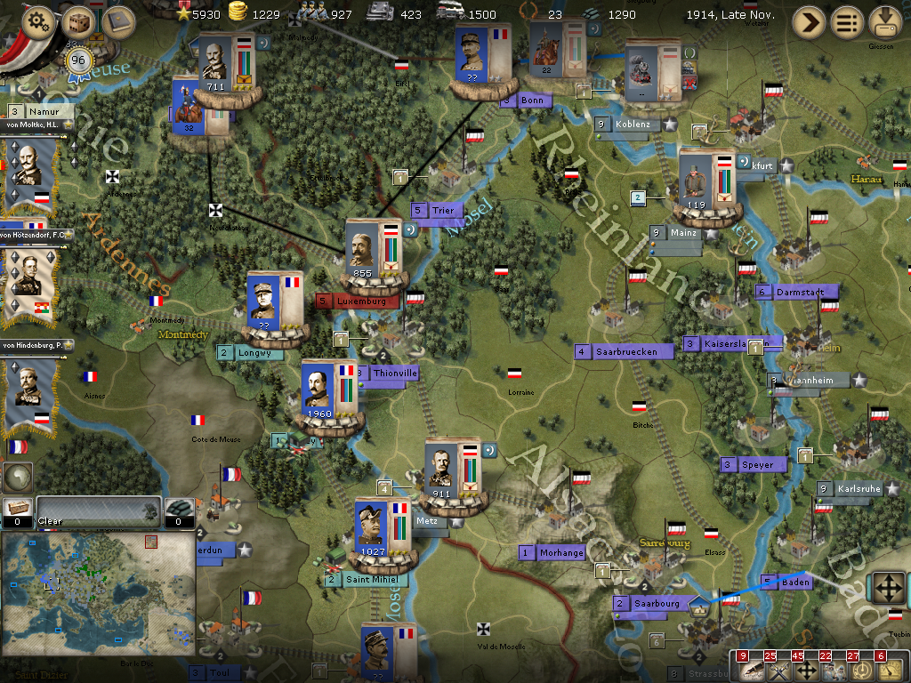 [color="#0000FF"]French Border:[/color] The large force that was around Longwy seems to have spread out a bit, with a good emphasis around my much surrounded holding of Saint Mihel. I will be looking for weak spots around the periphery that won't allow for WE MTSG. At first blush, I am contemplating attacks at Sedan (with a newly promoted von Gallwitz - I took a VP hit but think it was worth it) in the north and Vosges in the south.