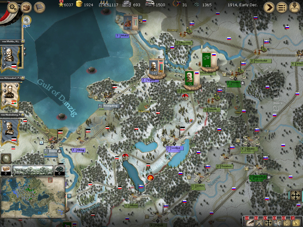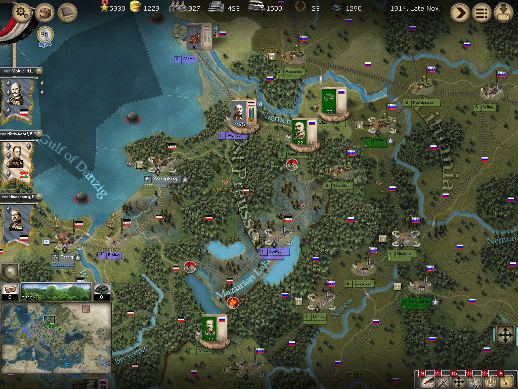 [color="#006400"]Russia:[/color] This was actually the front that raised my eyebrows. The EE is going aggressive and did enter Gumbingen but a battle did not ensue with troops from both sides sitting there. I waffled a bit with my army in Konigsberg and did not send that to Gumbingen which might have brought battle, but I'm waiting for a pretty decent general named Hindenburg. For starters, I will be just trying to hold the line at minimum on this front with the foreknowledge that a good RGD is always possible. :w00t: The Russians also made incursions into Maseren and Allenstein but did not rush all their troops into the region and wisely left an Army in Kaminiets to possibly blunt my invasion through this route. The center appears weak in the strategically rich cities of Dubno, Rowno and Kowel but my recon is not good enough to know for sure.