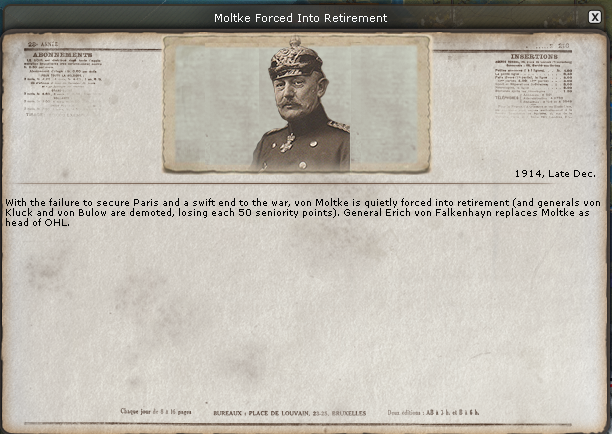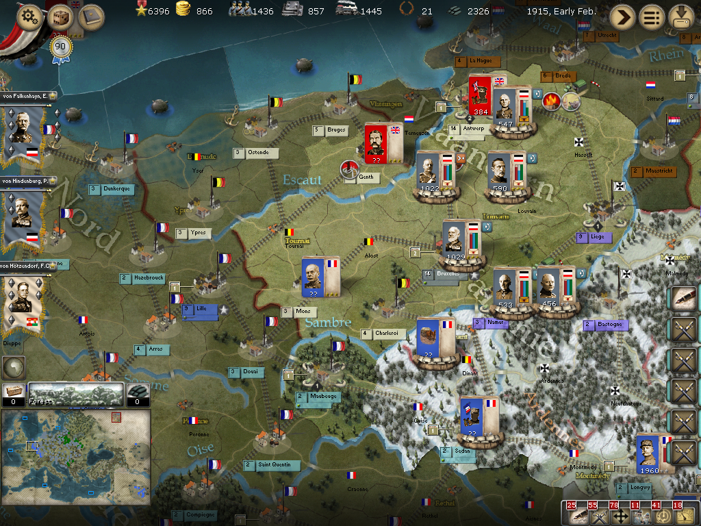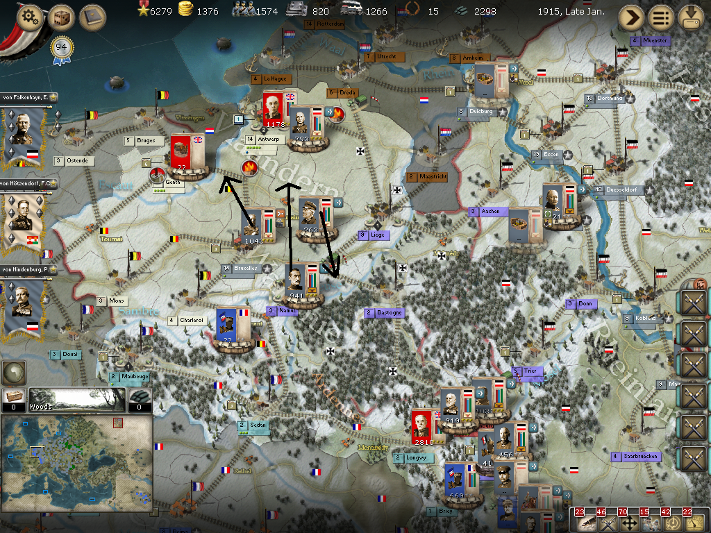 Belgium:[/color] My intelligence was lacking and von Heeringen's Armee met a superior force in Mons, was nearly decimated after two battles and retreated to Charleroi. The WE reinforced Antwerpen and will most likely have to be where I face battle on this front and avoid for now the large force in Mons. Not a good start for a Spring offensive and a notice on not fighting during the winter months.