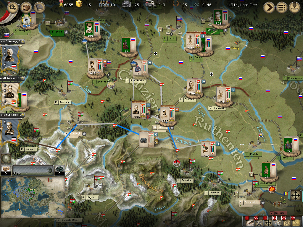 [color="#008000"]Central Russia:[/color] More forces arrive in Rawa Ruska to beef up the K.U.K. but three battles fought in Dubno with one victory followed by two defeats that force a retreat of the 2 and 3 Armee's plus a Korps. The overall outcome is not too bad as the Russians suffer more losses and we gain 1 NM. The 5. Armee successfully retakes Kaminiets as Russian forces look undermanned in this area.