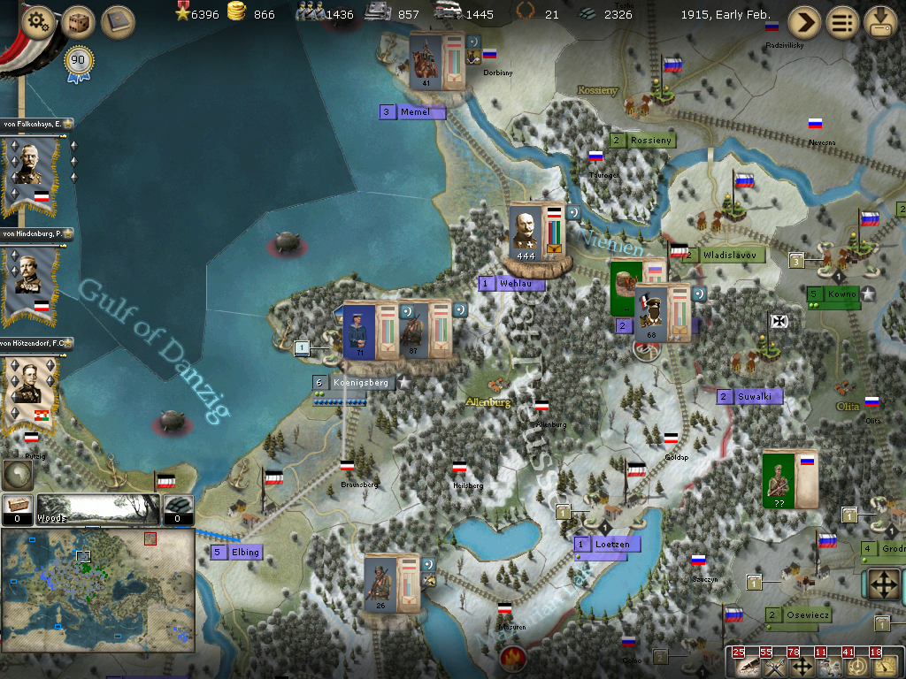 [color="#008000"]Northern Russia:[/color] The Fleet (with 140 ocean-going transport capacity) has been harboring in Konigsberg for quite some time because I wanted to make sure it was ready at first sign of good traveling weather; there is still freezing rain in the Baltic this turn. I read on the forums that someone took Petrograd and was moved to Archangelsk, so I believe I will take the port of Vyborg first. In my last campaign the game ended when I took Petrograd so I didn't notice if that had happened to me, but why take a chance. Plus, Vyborg will be lightly defended and more assured of a quick assault. I also hope to take Mlawa, to tighten the noose around Warsaw.