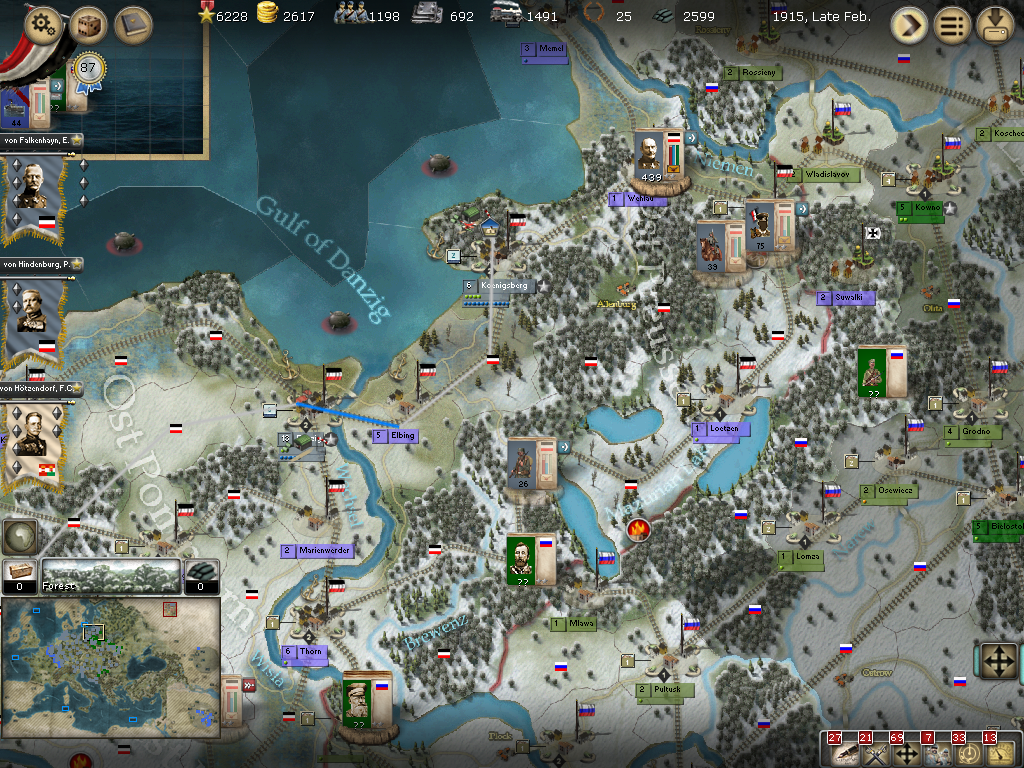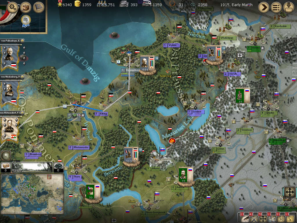 Eastern Germany:[/color] The Hoffman event was played; In my first campaign the Russians were not able to step into Germany so this is the first time I really get to see how that event plays out! Hindenburg is to march into Wehlau and Gumbinnen, unfortunately, that supply wagon just north of Gumbinnen is out of reach, but most likely is on its way to the forces, after all, humans don't lose them as easily as the AI does! A reserve division is going to the south of Loetzen to hopefully repair the rails while von Mackensen is setting of to the NE of Thorn to hopefully wipe out the small unit there and be in position to help out in Thorn the next turn. Other units are moving to Elbing to take out the cavalry unit there. Von Below is in charge of the defense of Thorn, but don't expect any fighting there this turn.