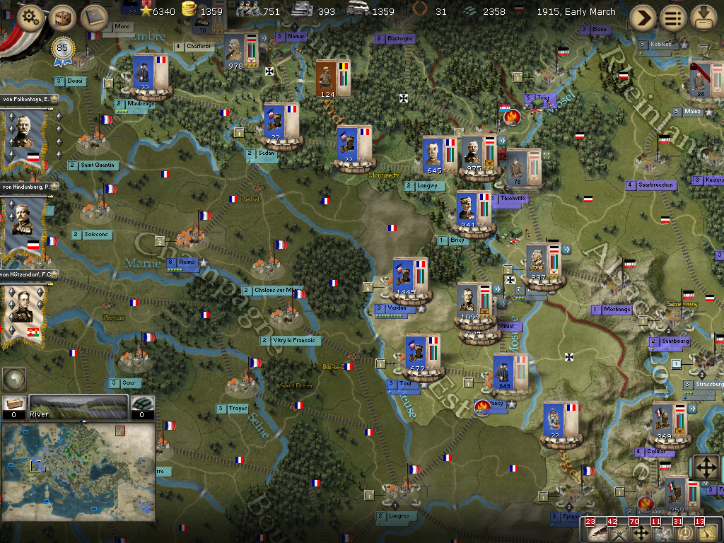 I'm solidifying the Mons-Bruxelles-Namur line to see if I can draw more WE troops away from the Luxembourg defenses while maintaining MTSG at Namur. The siege in Amsterdam is continuing. Moving a good force to defend the Moiselle River SE of St. Mihel. This will hopefully surprise the WE and force it to defend Nancy as well. Forces are still on the way to Muelhausen to guard against the usual invasion there. Generals that were requested the previous turn are on their way to better organize the armies in the west.