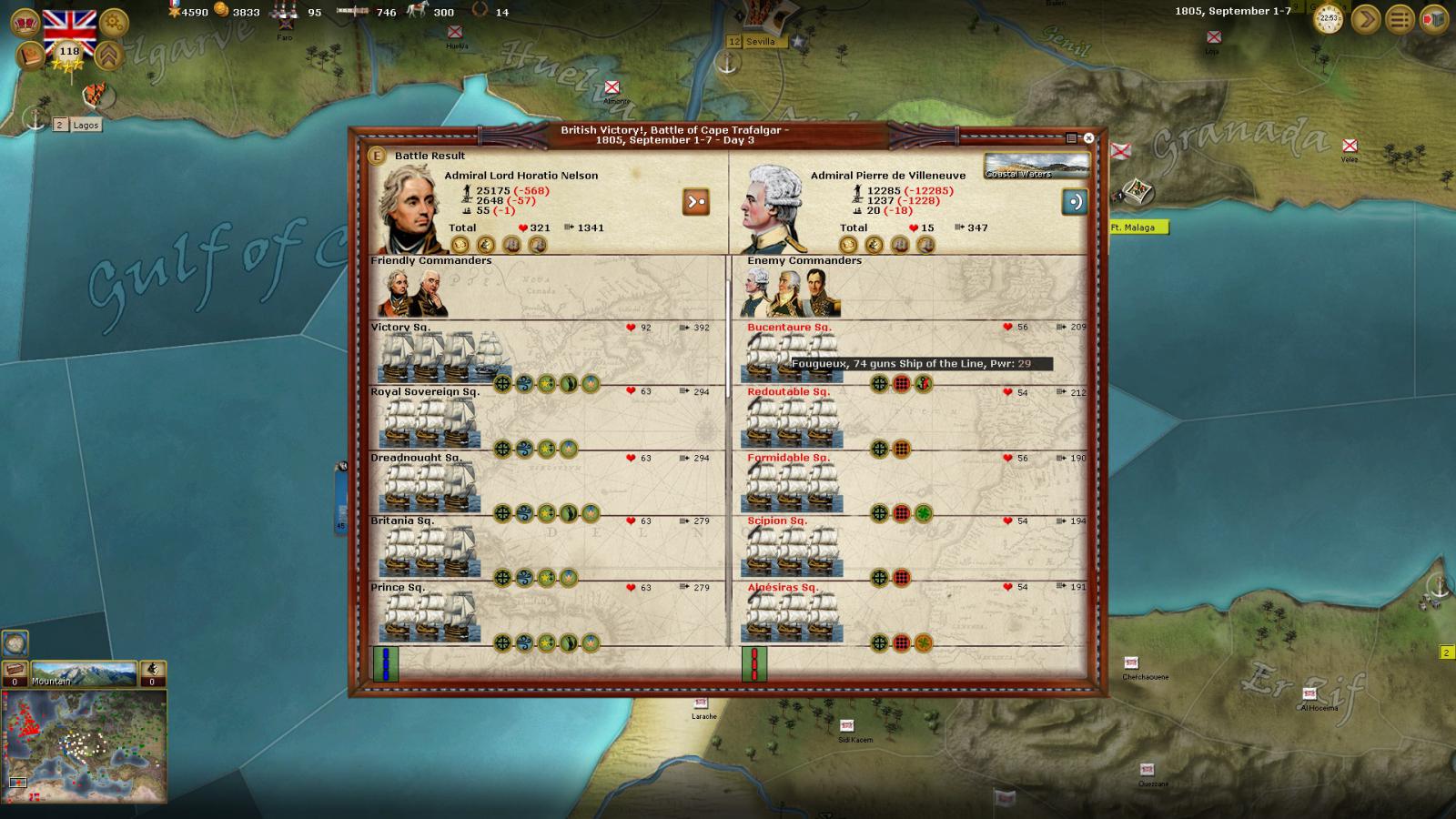 It's a sound strategy except that Athena is doing that with everything she has, including big Ship of the Line, and event troop transports! That translates in some very one-sided naval battles, as my fleets almost always manage to catch slower ships and destroy them piecemeal! It's not very fun and leaves me no hopes of fighting a big, Trafalgar style, battle. I've tried to tinker with AI settings, but this happens every time