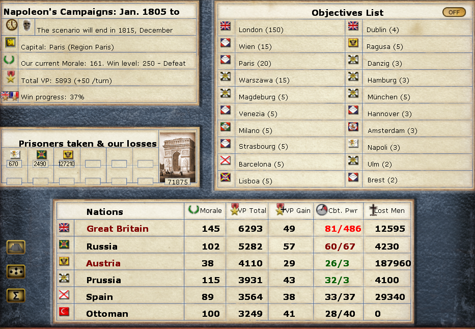 Fighting Austria (And England), after having knocked Sicily/Russia out of the 3rd Coalition. Warscore 189, Casualties around 188K.