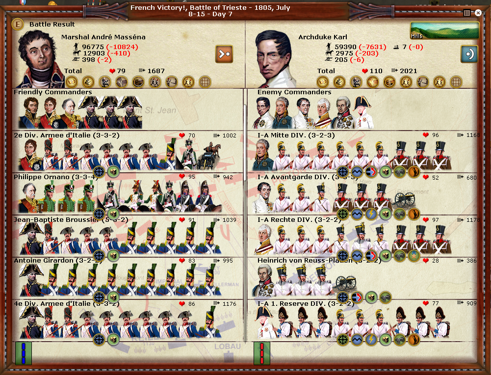 Thus the battle of Trieste takes place between 97,000 french and 59,000 austrians. The battle is short but bloody, with nearly 11,000 French and 7,600 Austrian casualties. Although the result is a victory for my side, it seems a pyrrhic victory that gives me no national morale. Molitor's corps has suffered a lot and two of its divisions have lost half of their troops and are tired after walking through the mountains and fighting. The soldiers are worn out in an extreme situation and the Austrian army seems in better condition. However after the battle we have achieved 52% of the regional military and therefore I can put Molitor’s force in a defensive stance so he can recover. I hope he can resist with the support from the rest of the army...