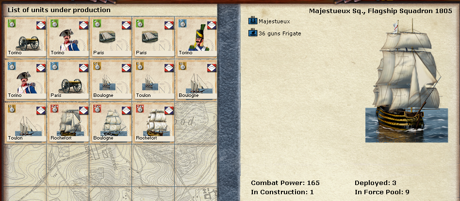 [color="#008080"] The list of production units shows you the naval units receiving replacements and what it will take to finish their building. I have highlighted the Majesteux flagship unit.[/color]