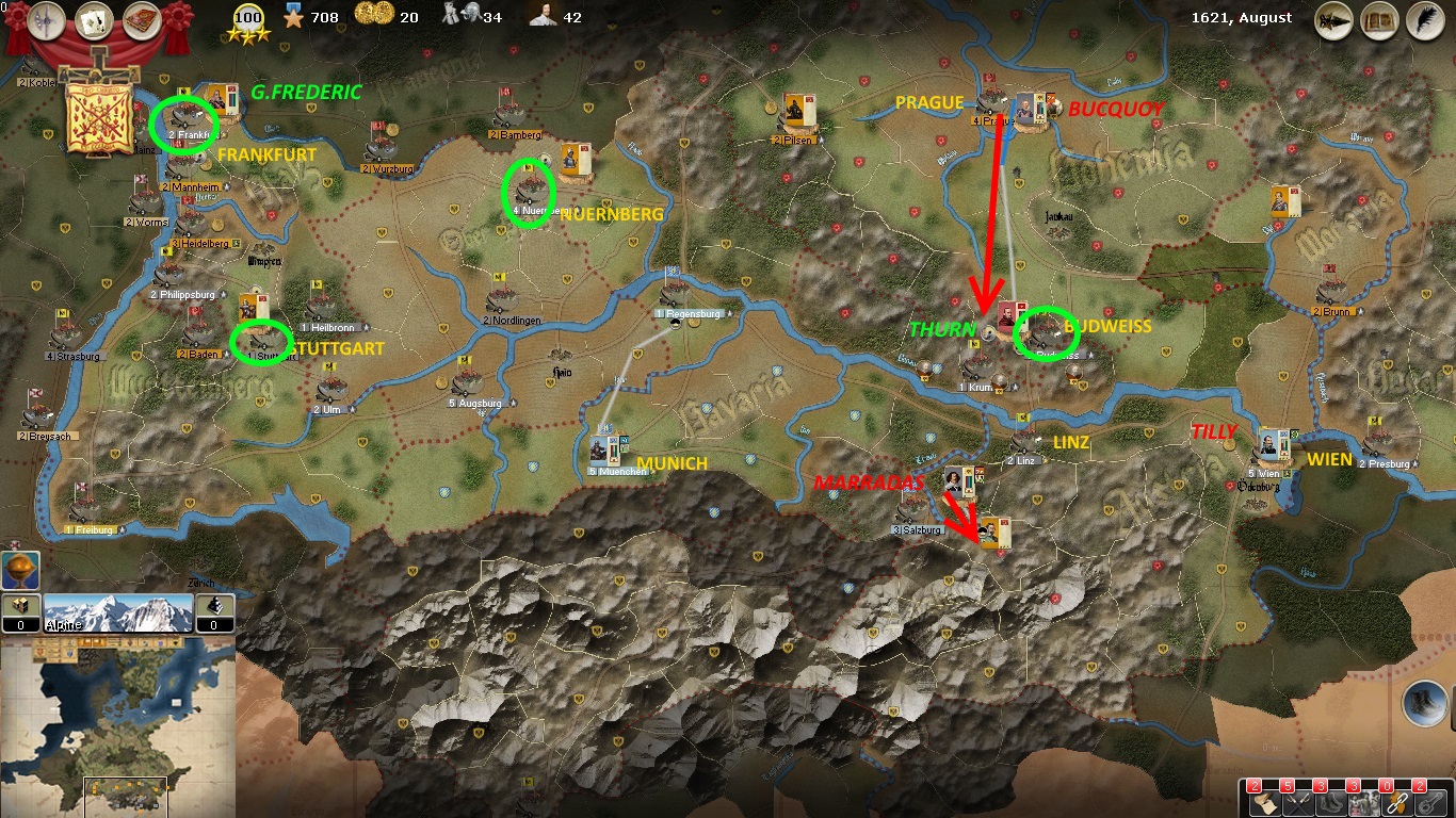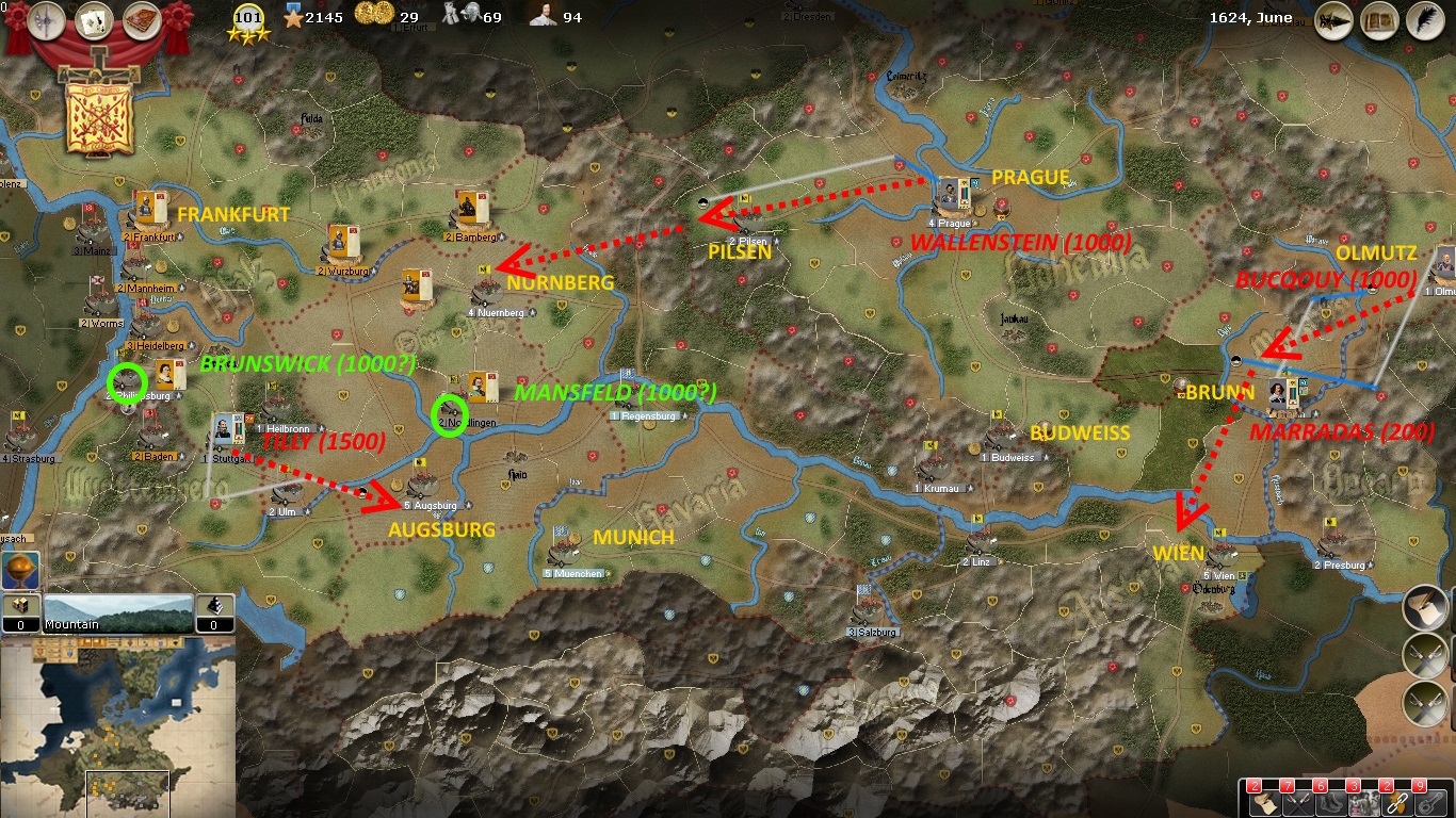 Tilly reaches Augsburg and finds a Protestant cavalry regiment harassing the city. They will be dispersed shortly. Then the good Count will rest his force at Augsburg and keep an eye on Brunswick and his army. Wallenstein reaches Pilsen and will now move on Bamberg. Bucquoy arrives at Brunn and will continue south to Wien. The large Protestant army under Brunswick remains at Philippsburg, besieging the city. The most surprising move is that of Mansfeld, moving swiftly eastward with a small force. He is approaching Linz and may threaten Munich, Linz, Prague or even Wien. Bucquoy will soon be in a position to deal with him.