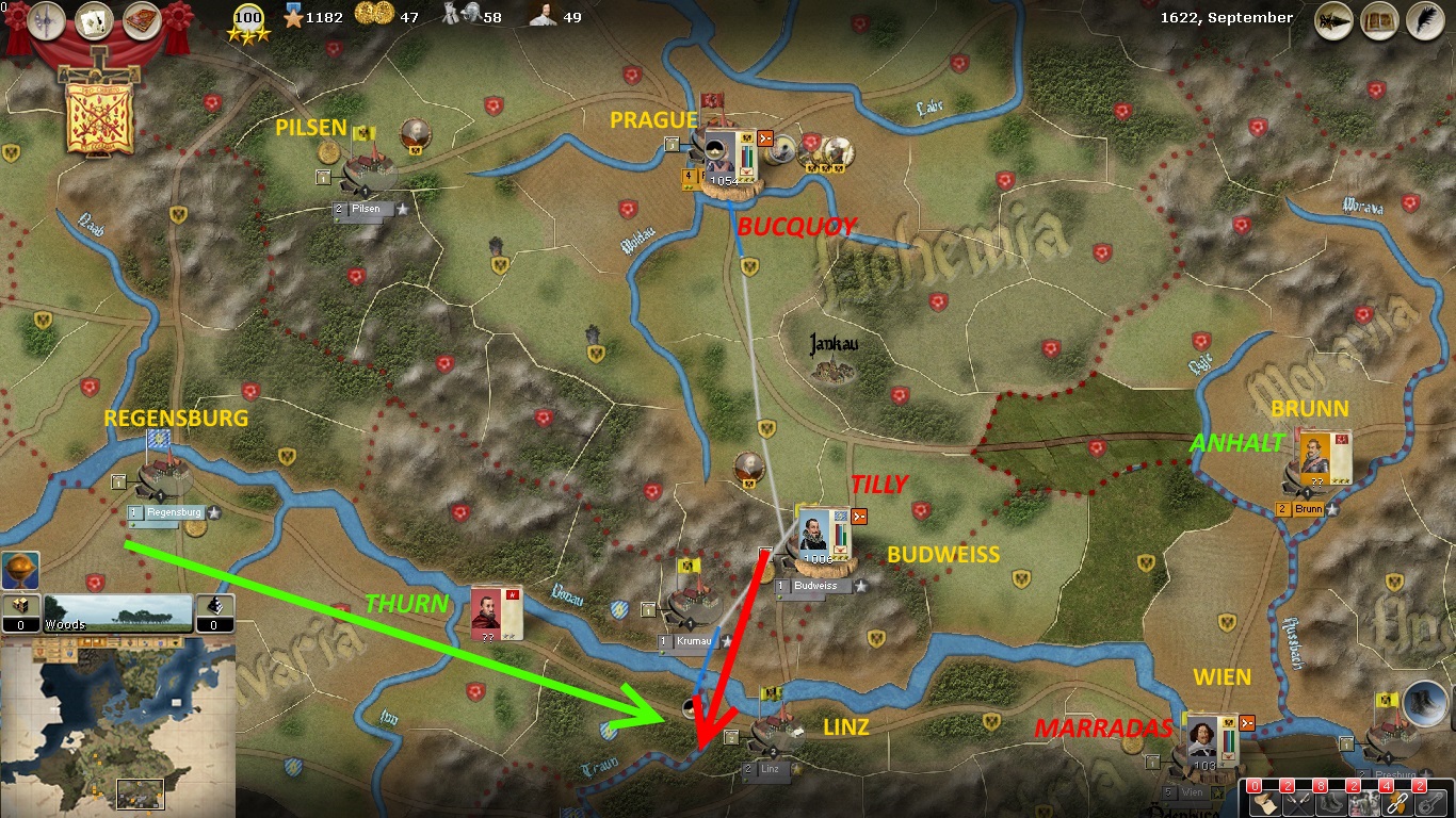 Minden falls to Brunswick in the north. No breaches at Prague yet, but hunger is starting to affect the garrison. Bucquoy's force is still fully supplied. Tilly will move south to cover Linz , as Count Thurn with a small force, moving at amazing speed, is approaching the city from the west.