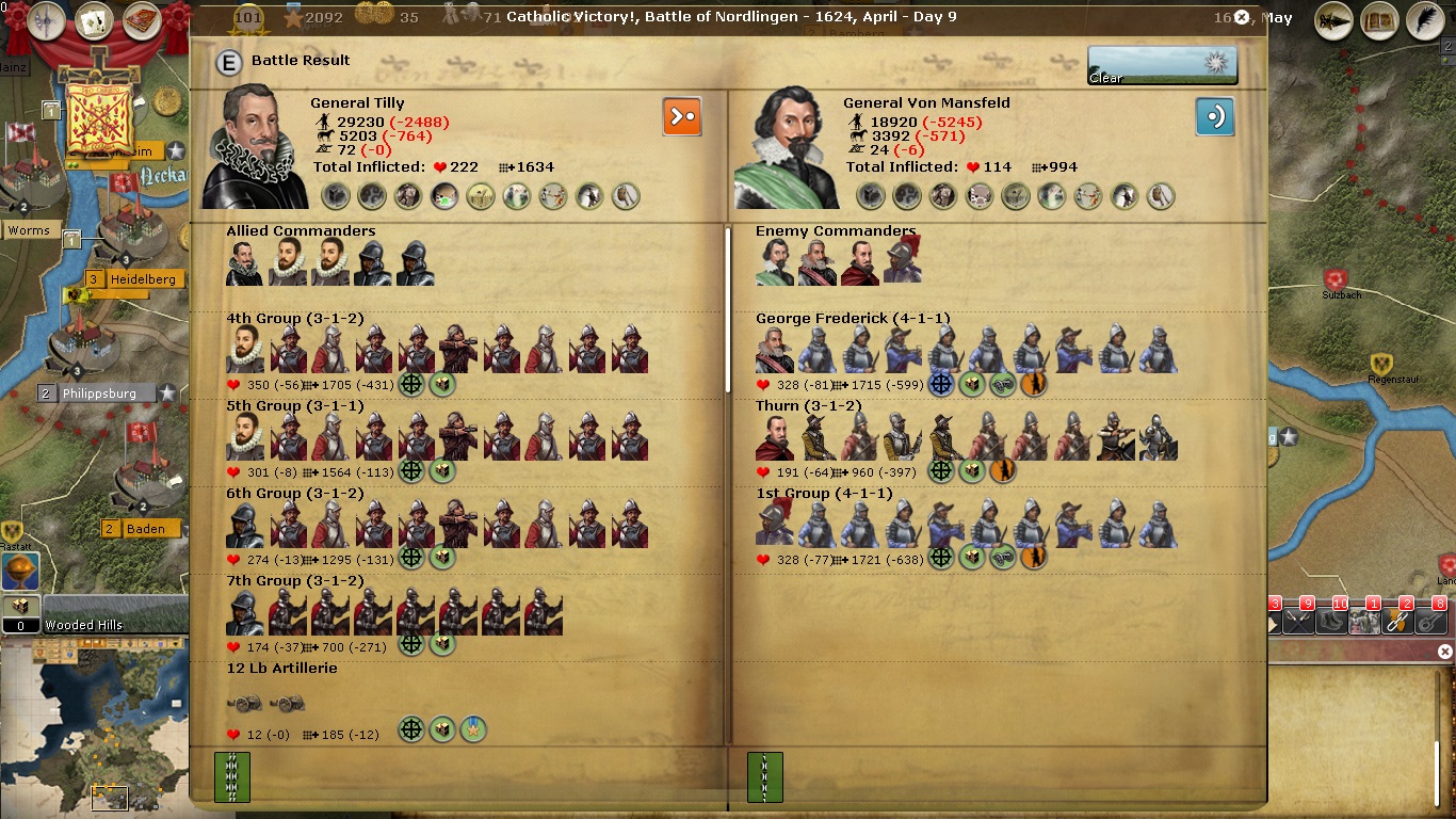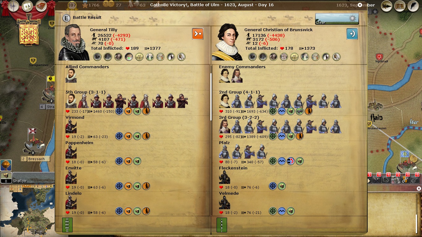 Regarding the Spanish troops, in my game the Spanish forces I received have largely been sent to the Low Countries. Marradas group was at CP 600 at his peak and now he is down to less than 200. And the Frankfurt garrison is down to two regiments from eight. It is a great loss to the Imperial efforts and hence, why I do not purchase replacements for them at this stage of the conflict.