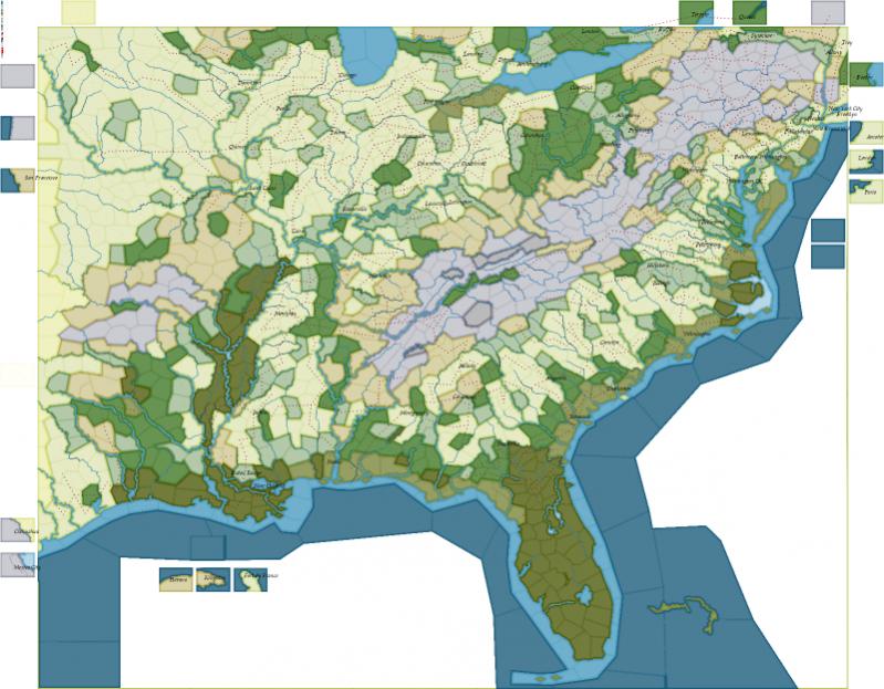Speaking of printing, it is always better to lighten up the dark colors. The lighter the better for printing since it won't use up so much ink and it makes anything added to the map show up better as dark on light. All that is needed is a shade or two difference on those greens and blues so you can see the difference.