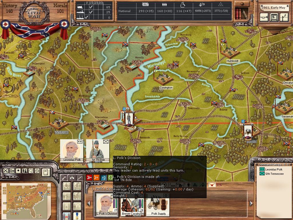 #2. In the 1861 scenario I can easily improve the Confederate forces by creating divisions. Maybe divisions should not be allowed for the Confederates until 1862, as this tended to be the case historically (union had divisions in 1861, Confederates used brigades), or, is this for AI improvement?