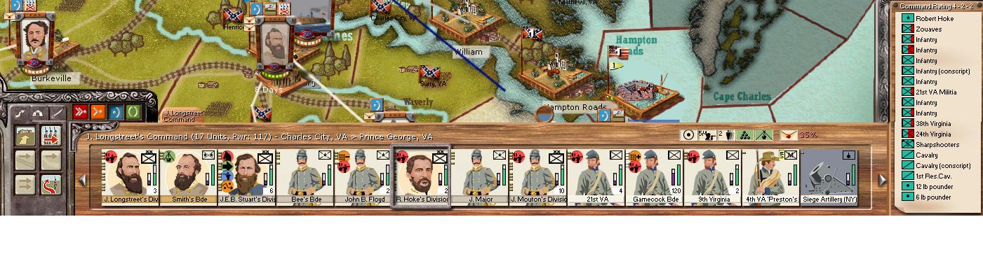 Here I am, flushed with complete victory. I go and open the game as CSA to see what my AI opponent had around the map. I was particularly interested in Longstreets command because it had a big row of green lights on the bottom, yet did nothing to prevent the fall of Richmond on the last turn, despite my besieging it for 3 turns.