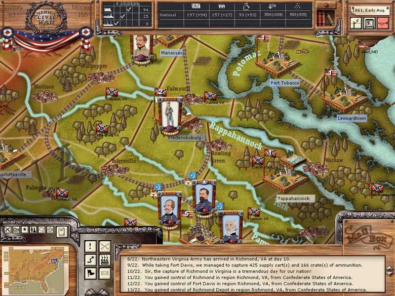 In late january my troops were still in their winter postitions. Everyone is in the towns to avoid attrition. The ai started suddenly an assault on Richmond. A small part (about 400 ap) arrived by ship and directly assaulted Richmond. Luckily I built a fortress there. The standard locked garrision and the just in time arrived Texas brigarde defended the city succesful. During the same phase the Army of the Potomac bypassed my defences at Alexandria (Jacksons corp in the town) and marshed directly after Fredericksburg. There Longstreet with his flullstrength division could fend the Army of the Potomac off (low intense battles). It seems that the Army has force marshed to Fredericksburg and had suffered a considerably amound of winter attrition.